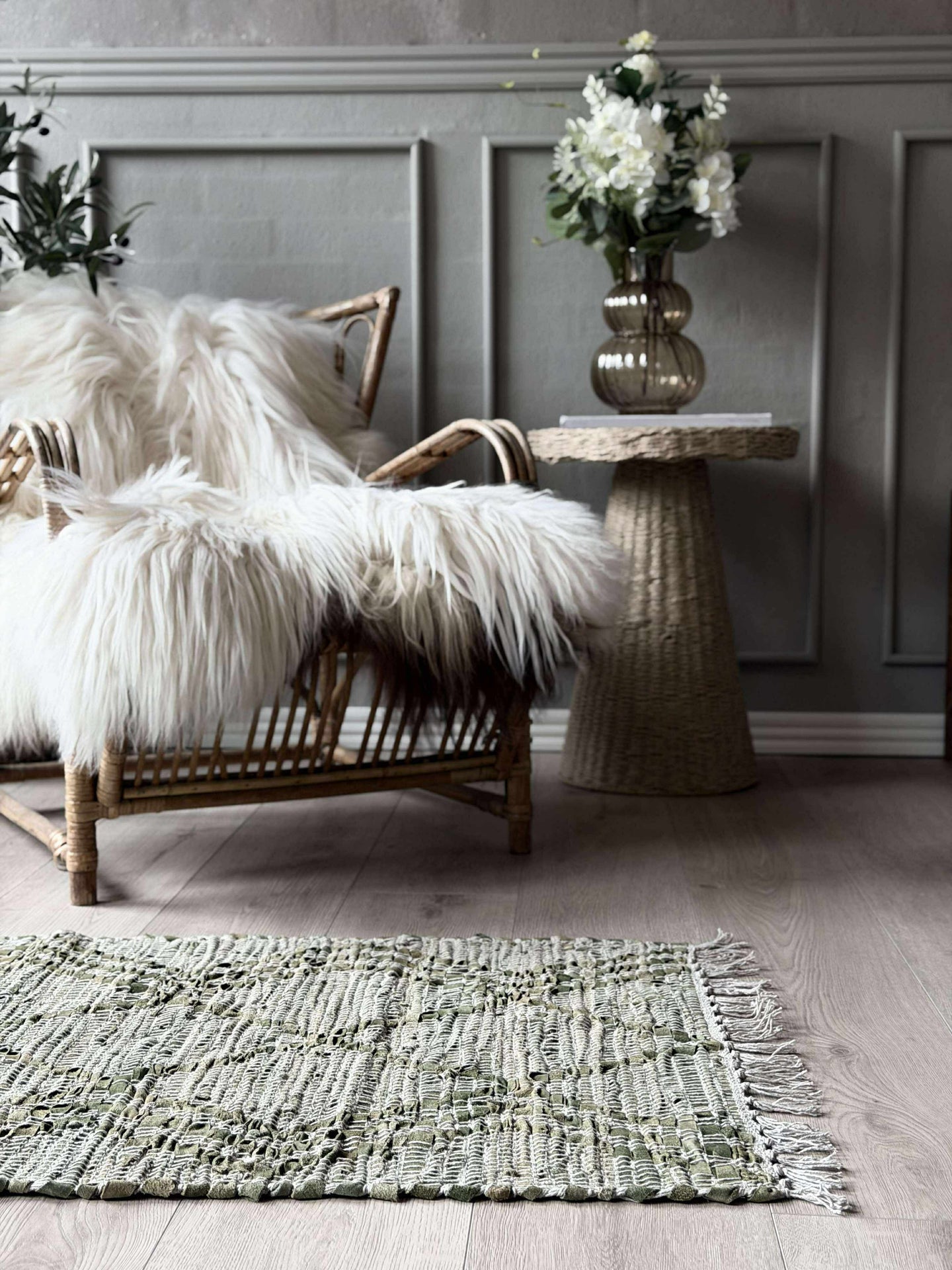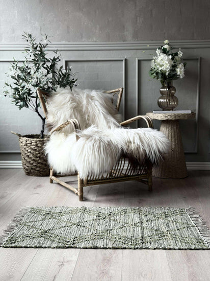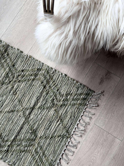 Entrématta i flätat läder och bomull med fransar i en grön variant. Den flätade strukturen ger ett lugnt, texturrikt uttryck som kan sätta tonen redan vid dörren.