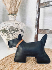 Denna dörrstopp, utformad som en hund, är tillverkad i svart skinn med en brun läderrem. Den enkla och stilrena designen passar utmärkt för de som uppskattar minimalistisk och funktionell inredning.