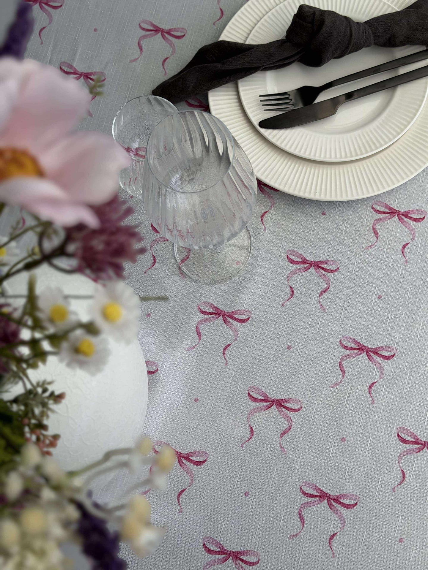 Trött på att ständigt stryka och byta ut slitna dukar? 'Duk med rosetter' ger ett praktiskt och tidlöst alternativ för att lyfta din bordsdukning. En lösning för dig som vill ha en lättskött och stilren vardagsduk utan krångel.