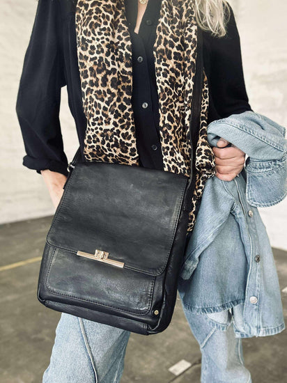 Elegant axelremsväska - Kalvskinn är en stilren väska i svart läder med ett enfärgat uttryck. På framsidan sitter ett vackert lås som ger väskan ett elegant och genomfört utseende. Kombinationen av den klassiska designen och det enkla färgvalet gör den lätt att matcha till många outfits och tillfällen.