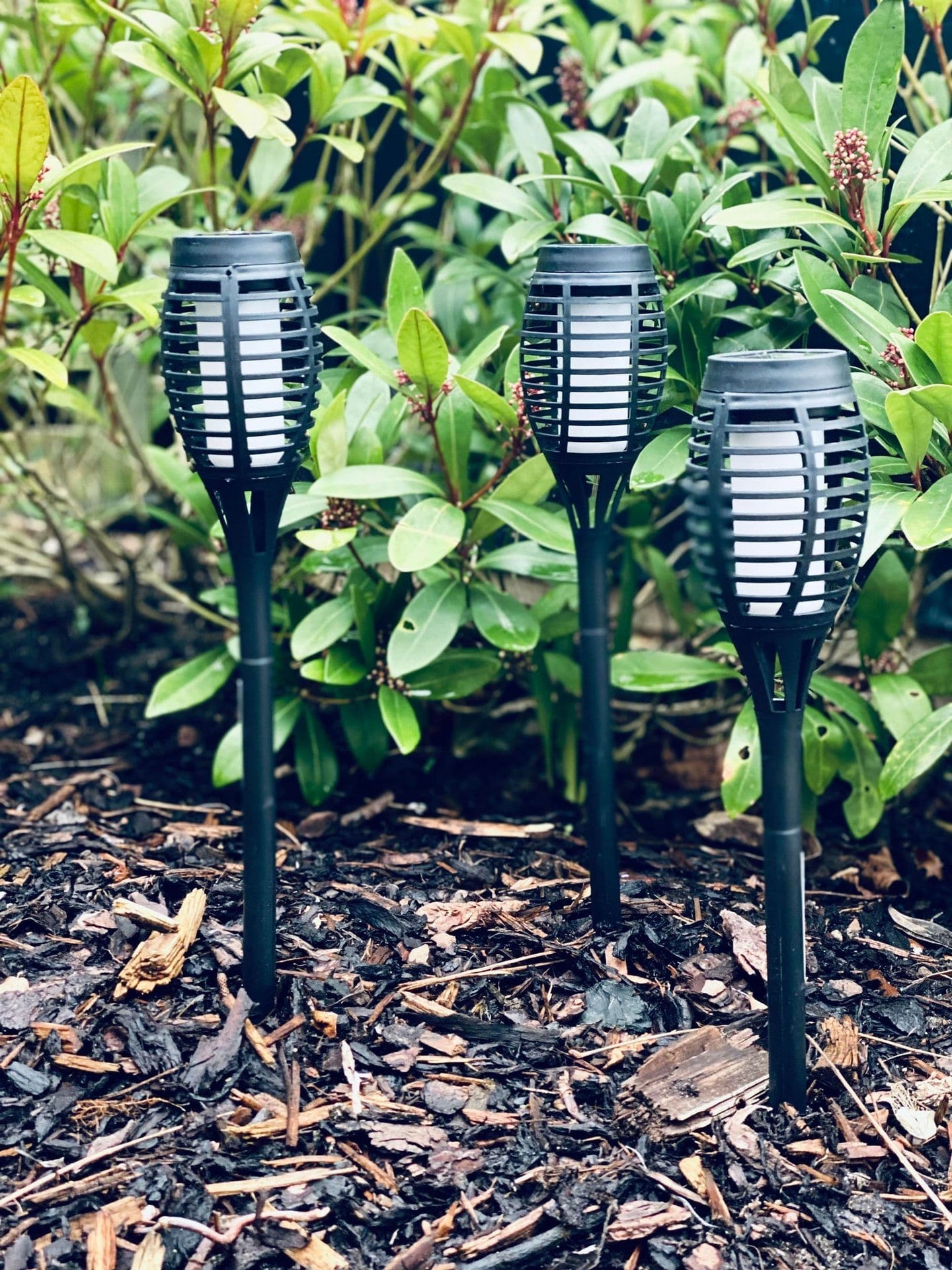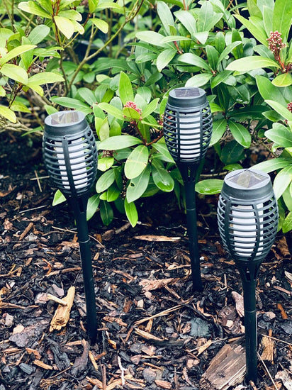 Skapa stämning i trädgården, på terrassen eller balkongen med ett set om 3 solfacklor som ger mjukt LED-ljus utan sladdar.