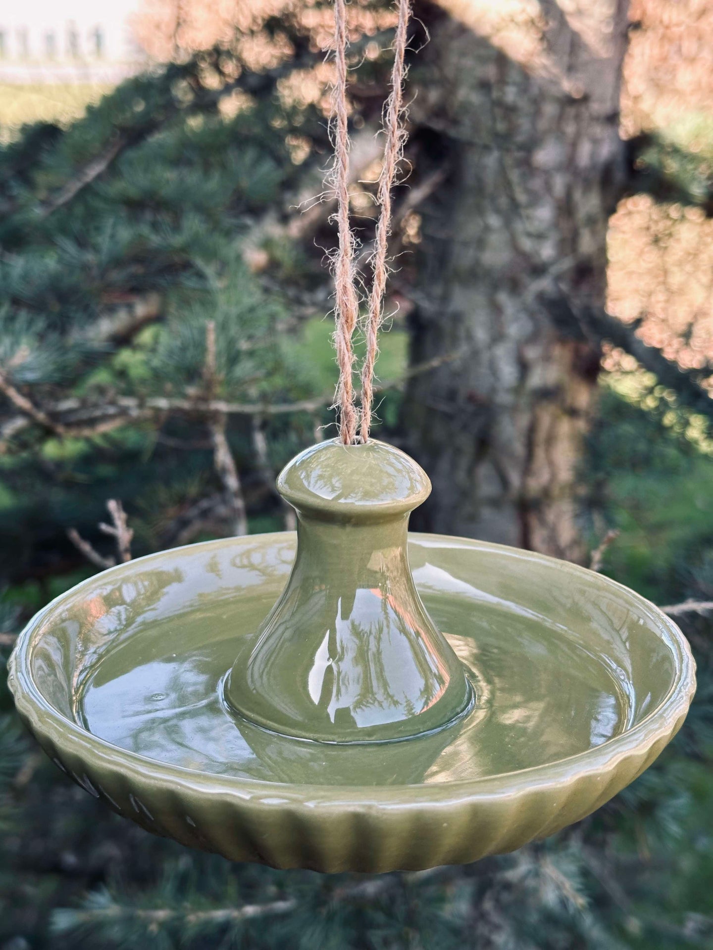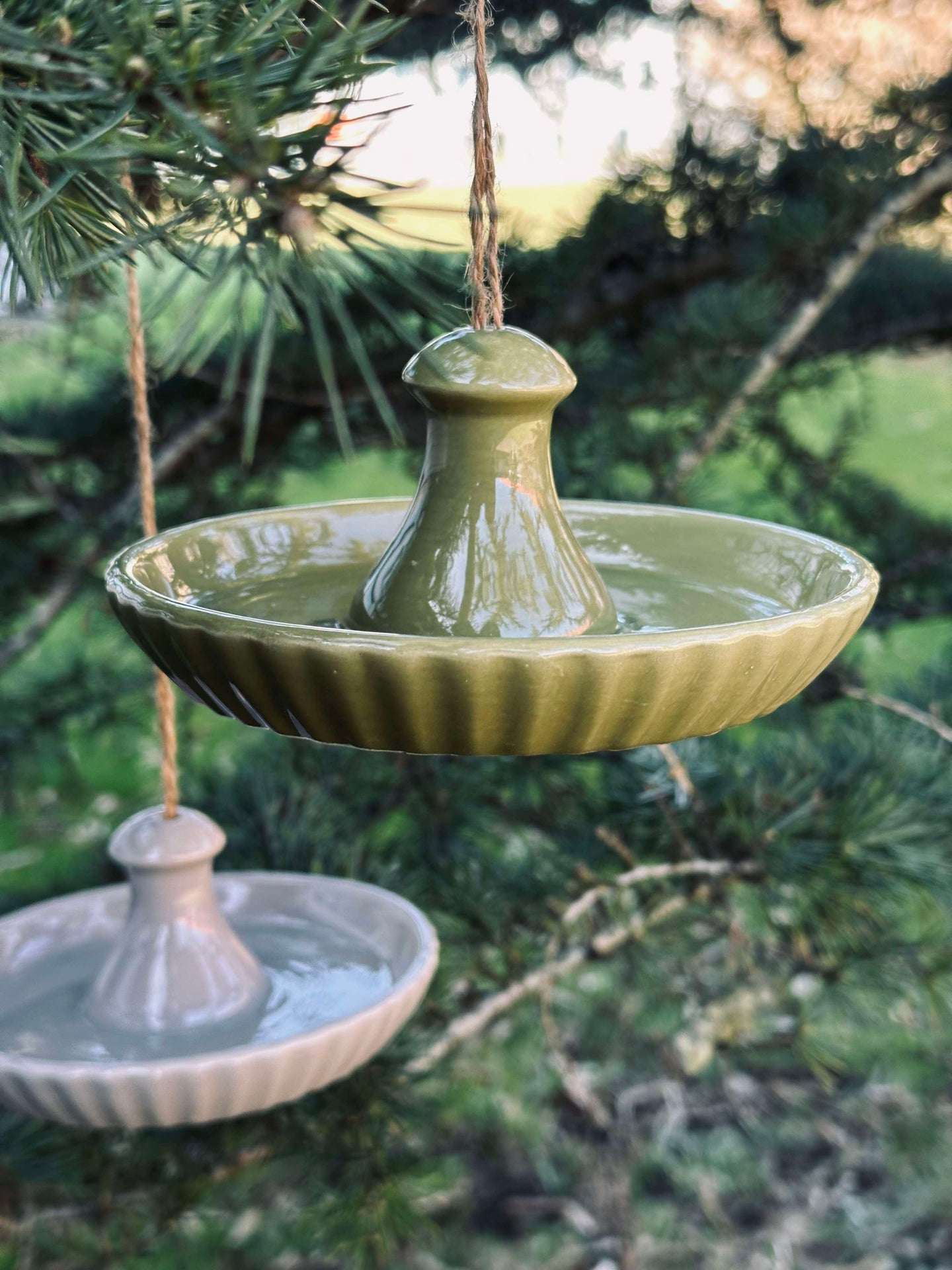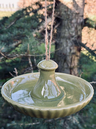 Trött på fågelmat som förstörs av väder och vind? Denna gröna keramiska hängare erbjuder en stilfull lösning för att mata dina trädgårdsbesökare, samtidigt som den smidigt smälter in i din utomhusmiljö. En enkel uppgradering för en mer naturlig trädgård.