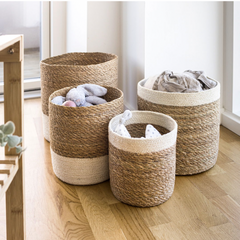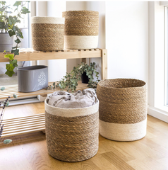 Trött på oreda hemma? Organisera enkelt med vårt set av flätade sjögräskorgar. Utmärkta för att hålla olika utrymmen prydliga och stilrena. Dessa korgar erbjuder en naturlig och funktionell lösning för att hantera förvaringsutmaningar i alla rum.