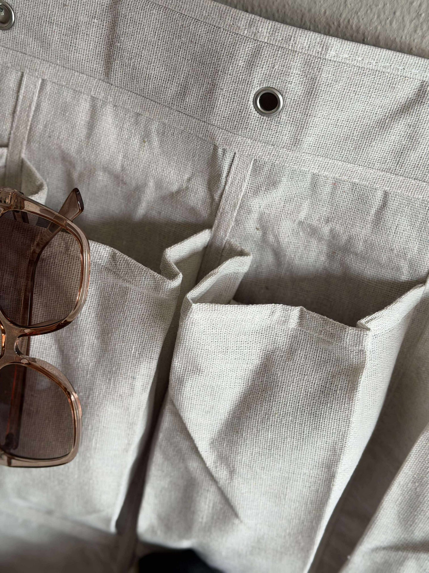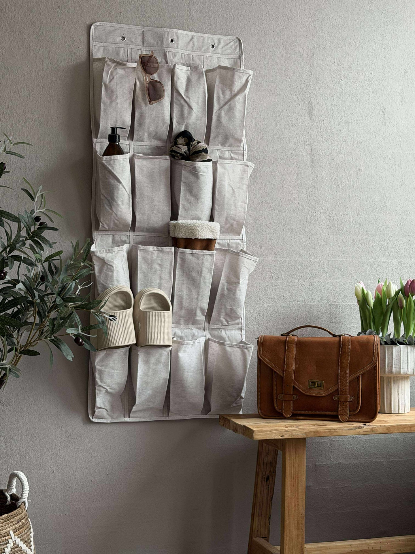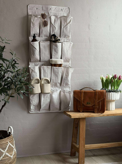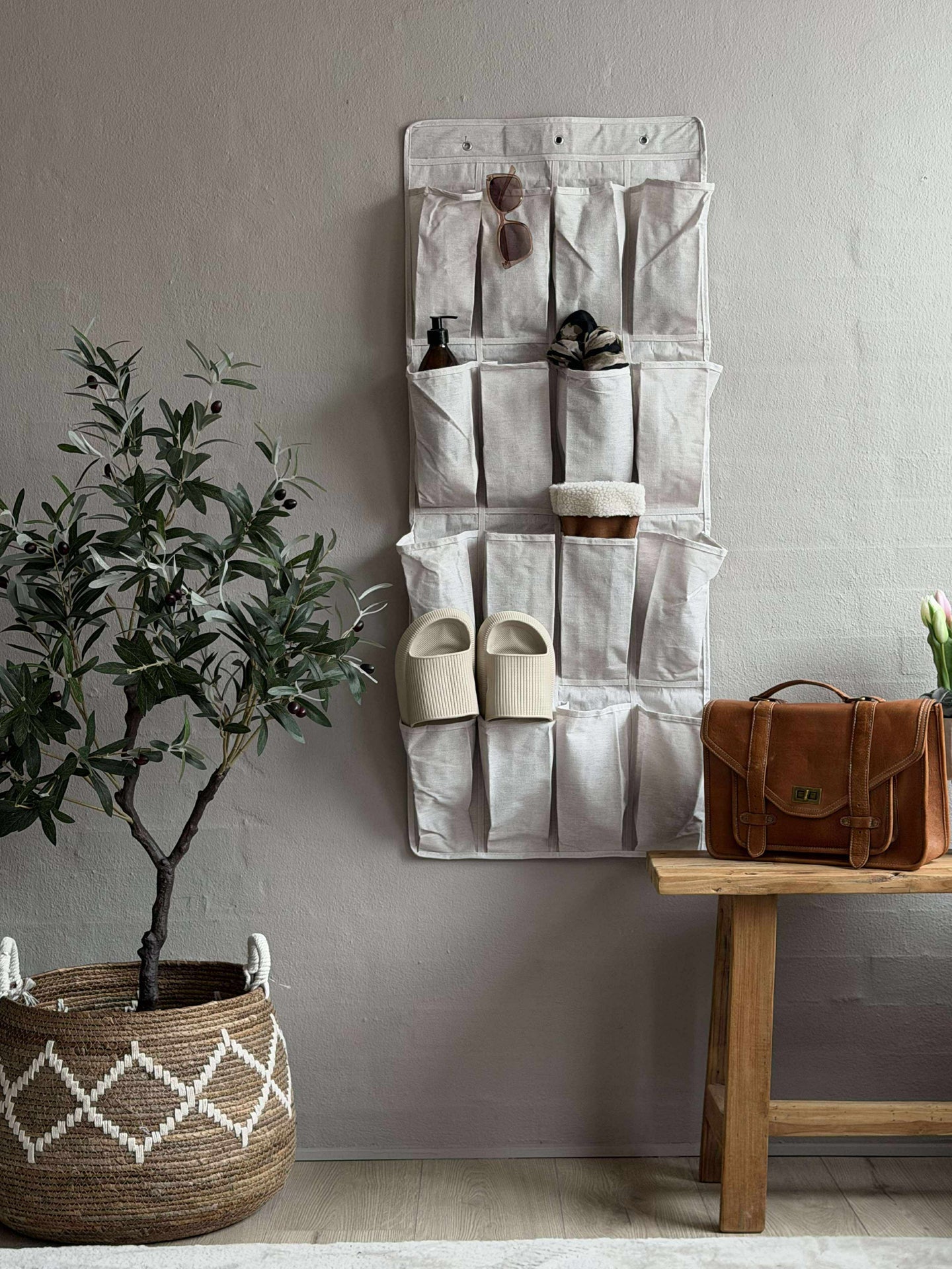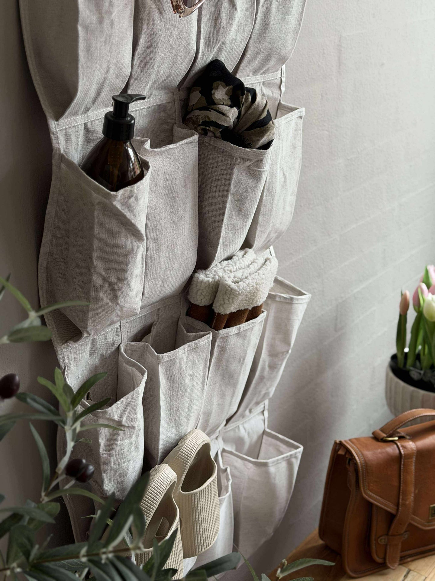 Förvaringslösningen är tillverkad av kanvas i en ljus linnefärg, vilket ger en naturlig och lugnande estetik till ditt hem. Materialets neutrala ton gör det enkelt att integrera i olika inredningsstilar, samtidigt som det erbjuder en slitstark och hållbar yta för daglig användning. Kanvasens textur bidrar till en mjuk och inbjudande känsla, vilket gör den idealisk för att organisera och förvara dina föremål med stil.