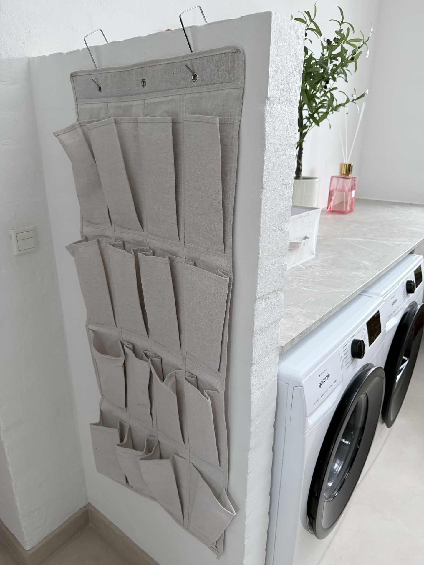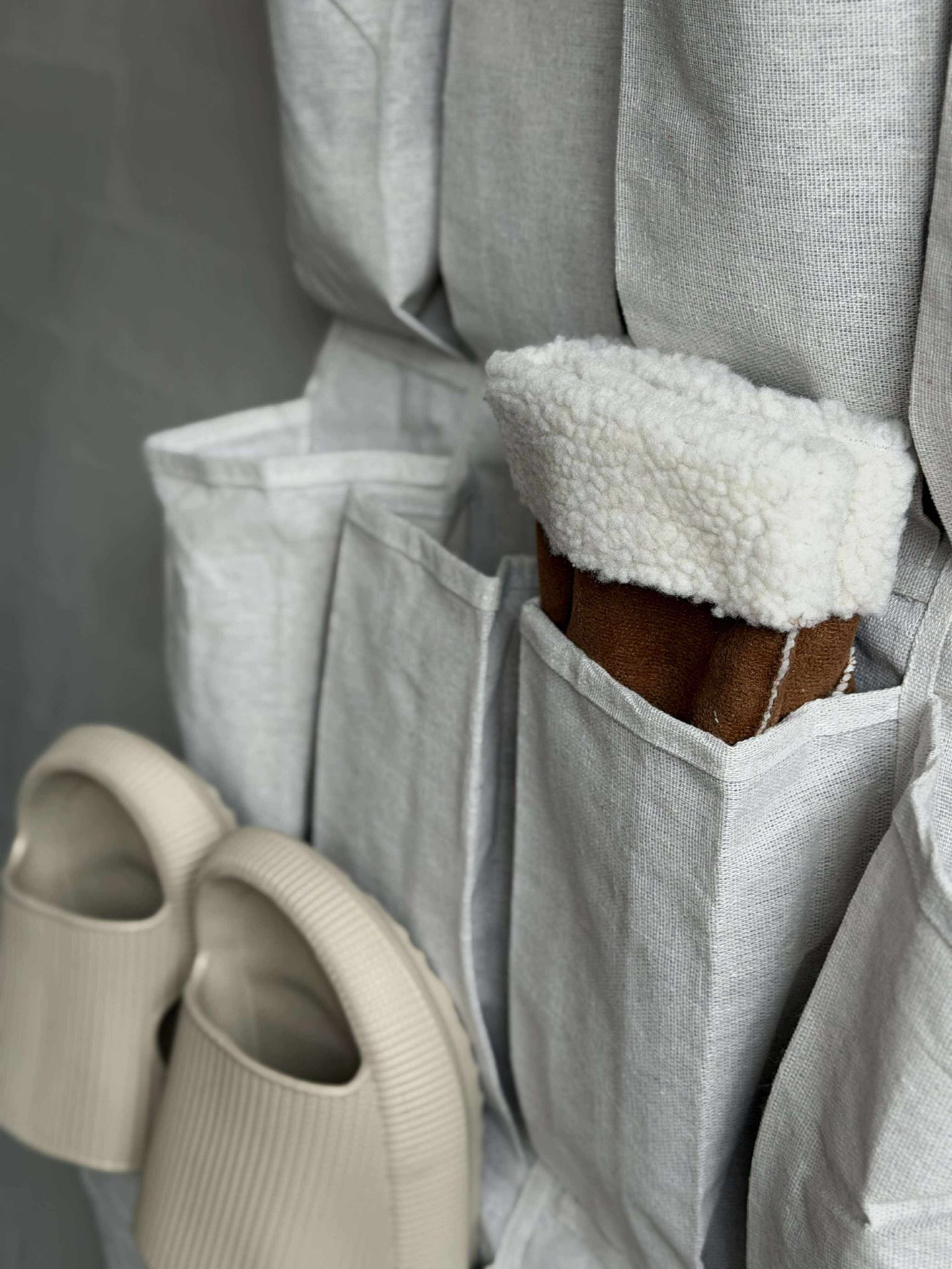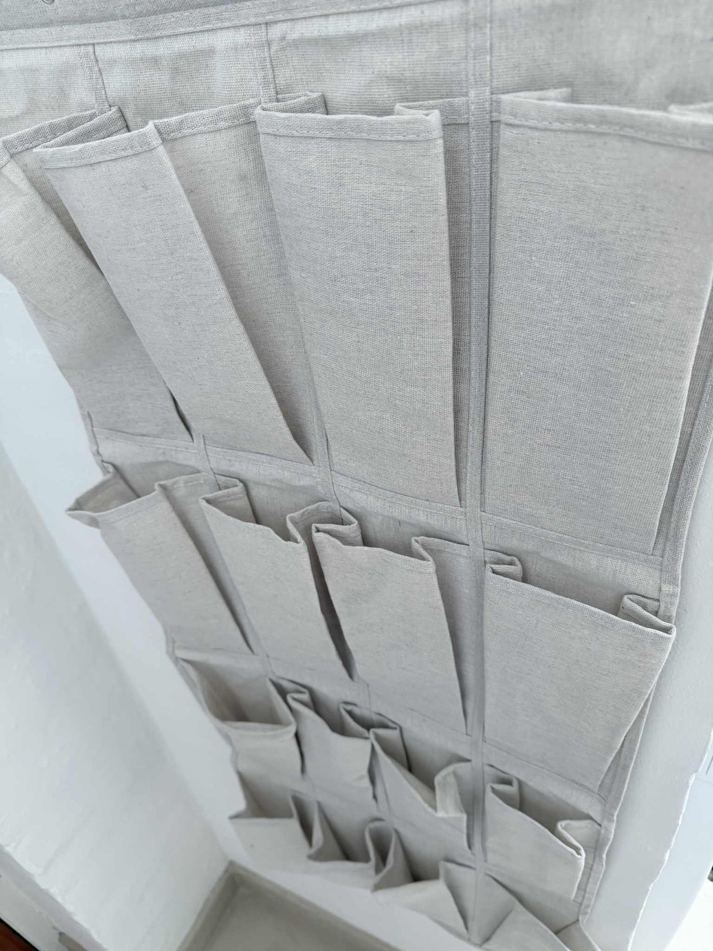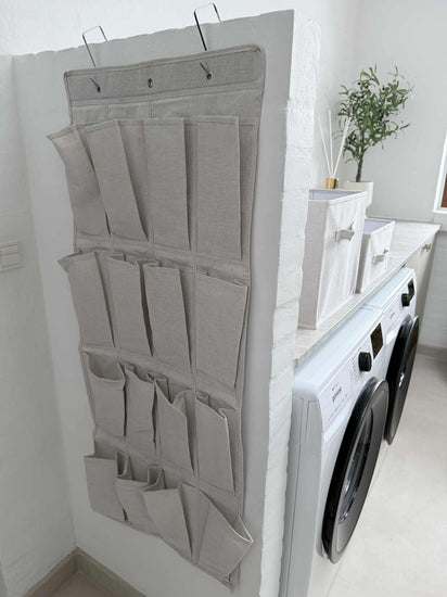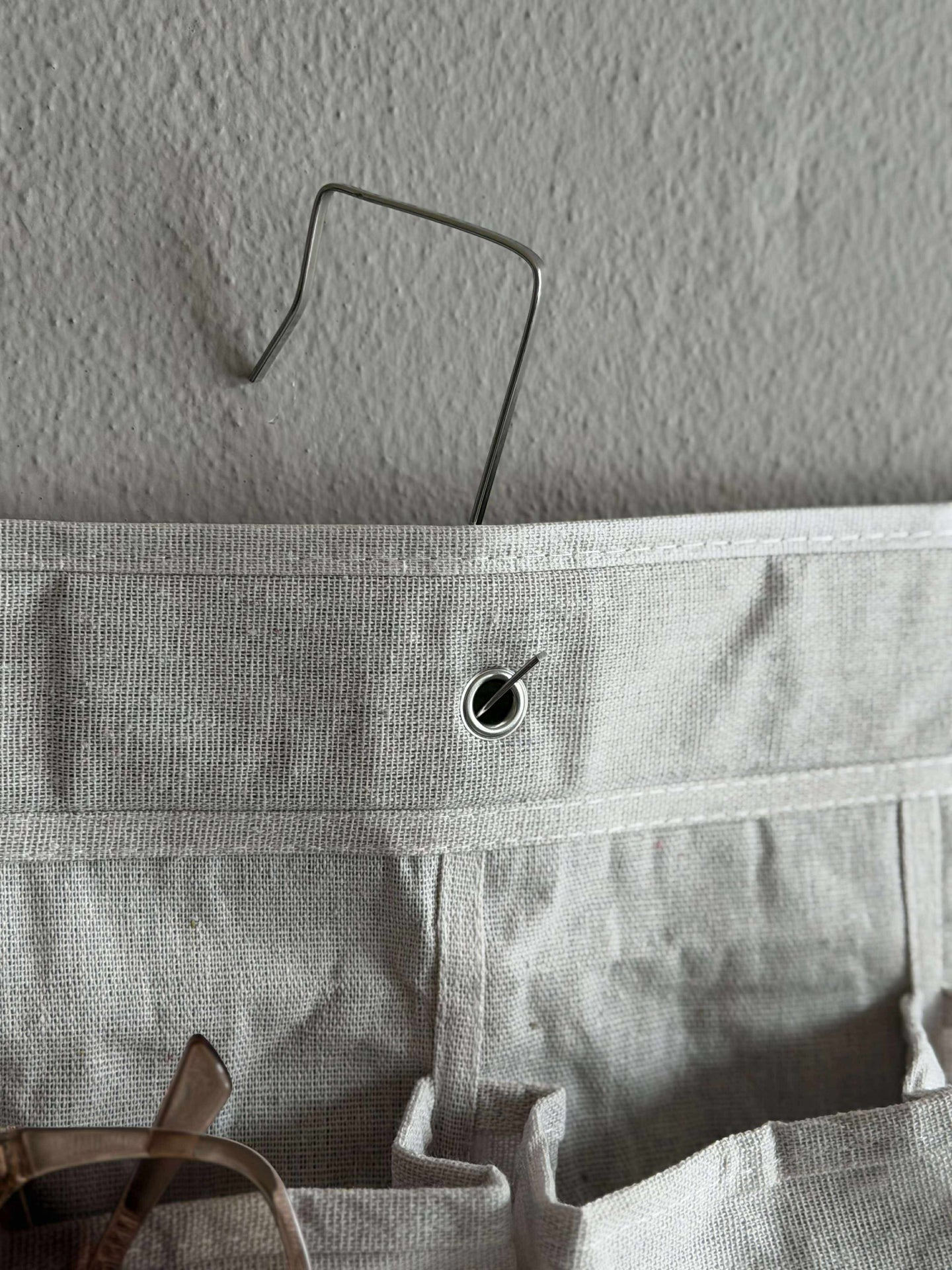 Förvaringslösningen är tillverkad av kanvas i en ljus linnefärg, vilket ger en naturlig och lugnande estetik till ditt hem. Materialets neutrala ton gör det enkelt att integrera i olika inredningsstilar, samtidigt som det erbjuder en slitstark och hållbar yta för daglig användning. Kanvasens textur bidrar till en mjuk och inbjudande känsla, vilket gör den idealisk för att organisera och förvara dina föremål med stil.