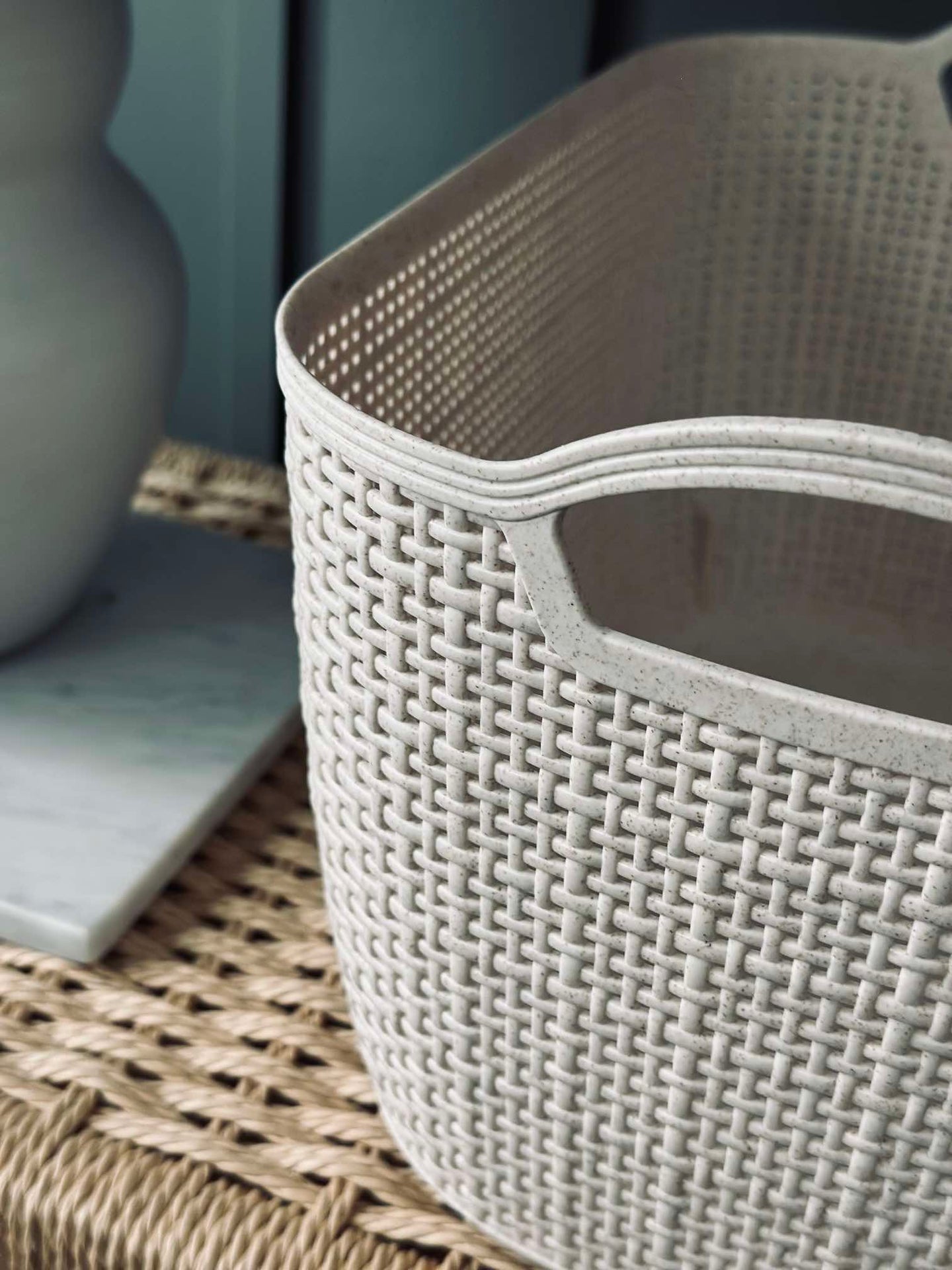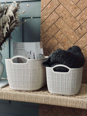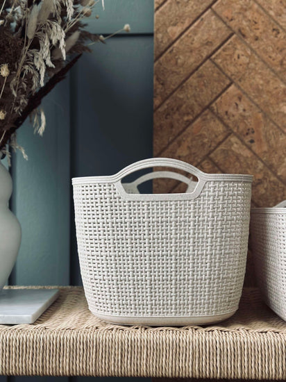 Materialet av plast gör korgen lätt och enkel att flytta runt i hemmet, vilket underlättar vid ommöblering eller städning. Plastens hållbarhet säkerställer att korgen behåller sin form och funktion över tid, samtidigt som den är resistent mot fukt och fläckar. Detta gör den idealisk för förvaring i både kök och badrum, där den enkelt kan rengöras vid behov.