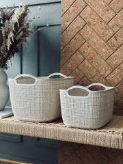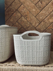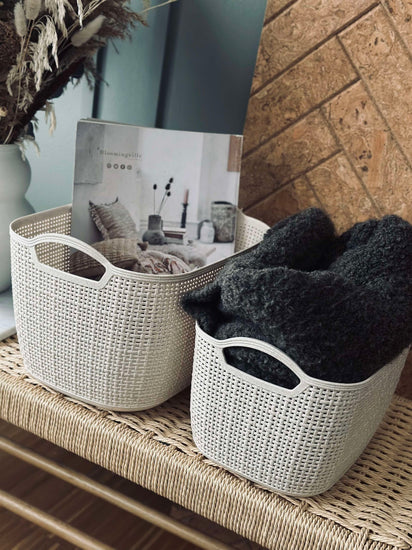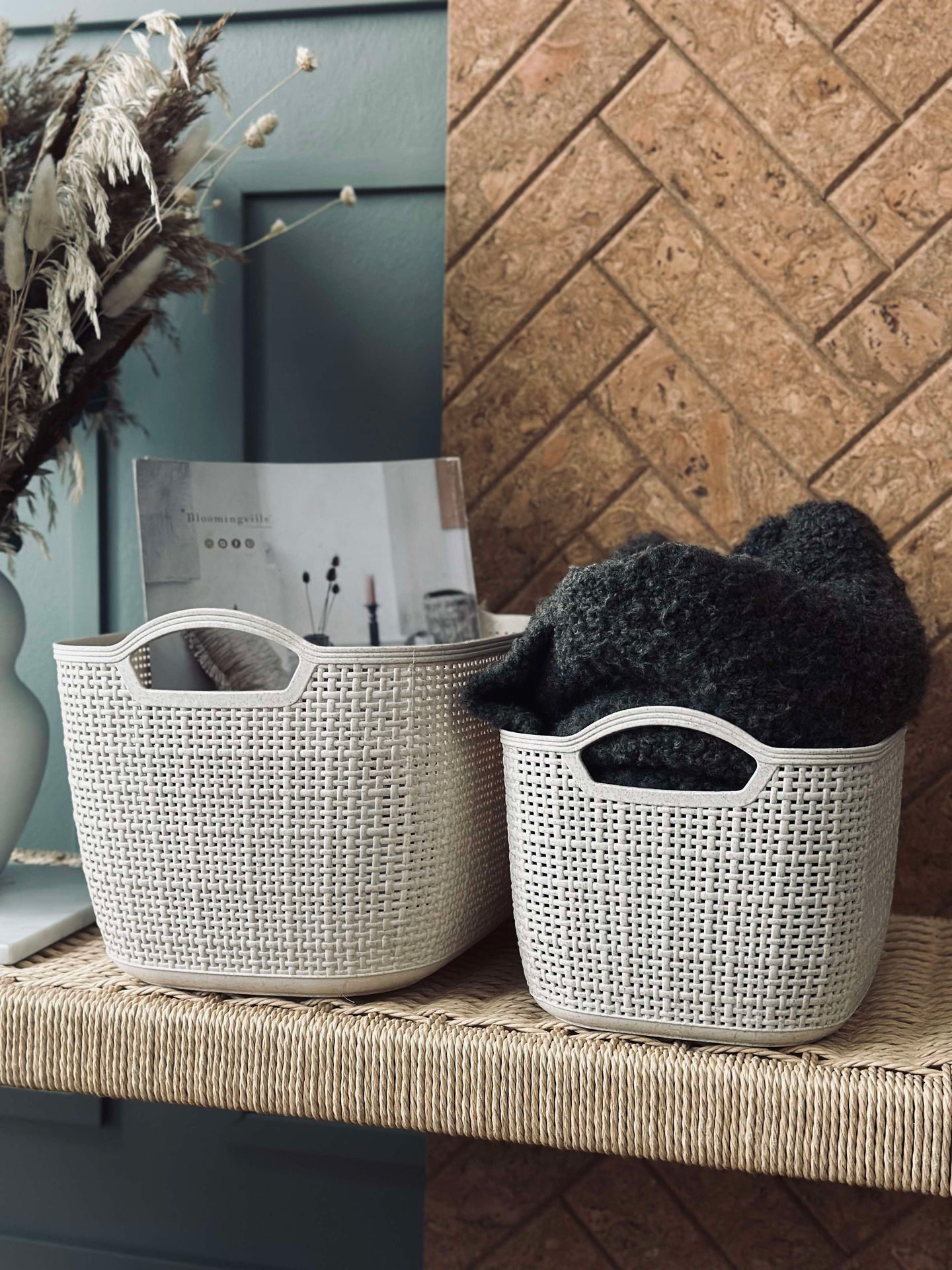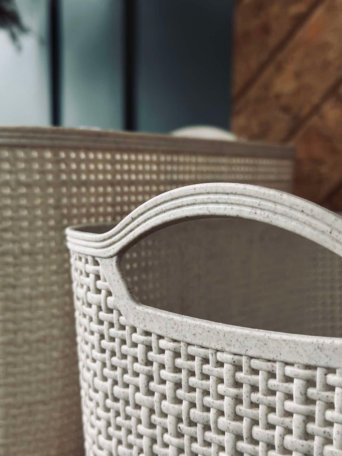 Plastmaterialet i denna förvaringskorg med handtag gör den lätt och enkel att hantera, vilket underlättar transport och förflyttning. Dessutom är plasten tålig och motståndskraftig mot fukt, vilket gör korgen lämplig för användning i olika miljöer, såsom badrum eller kök. Den släta ytan är lätt att rengöra, vilket bidrar till enkelt underhåll och god hygien.