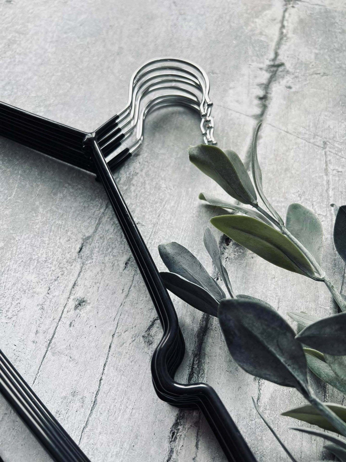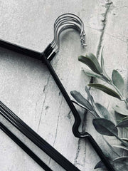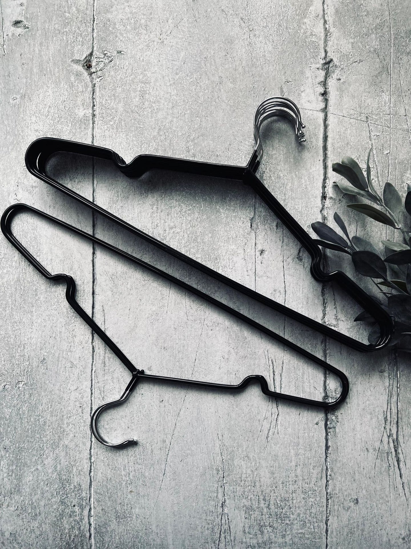 Våra svarta galgar är tillverkade av robust metall med en elegant svart beläggning. Denna kvalitetsdesign garanterar långvarig hållbarhet och motståndskraft mot slitage. Den svarta beläggningen ger galgarna en stilren look som passar i alla typer av garderober och klädrum. Dessutom skyddar beläggningen dina kläder från att bli skadade eller missfärgade.