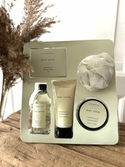 - Inkluderar kroppsskrubb för exfoliering och rengöring av huden