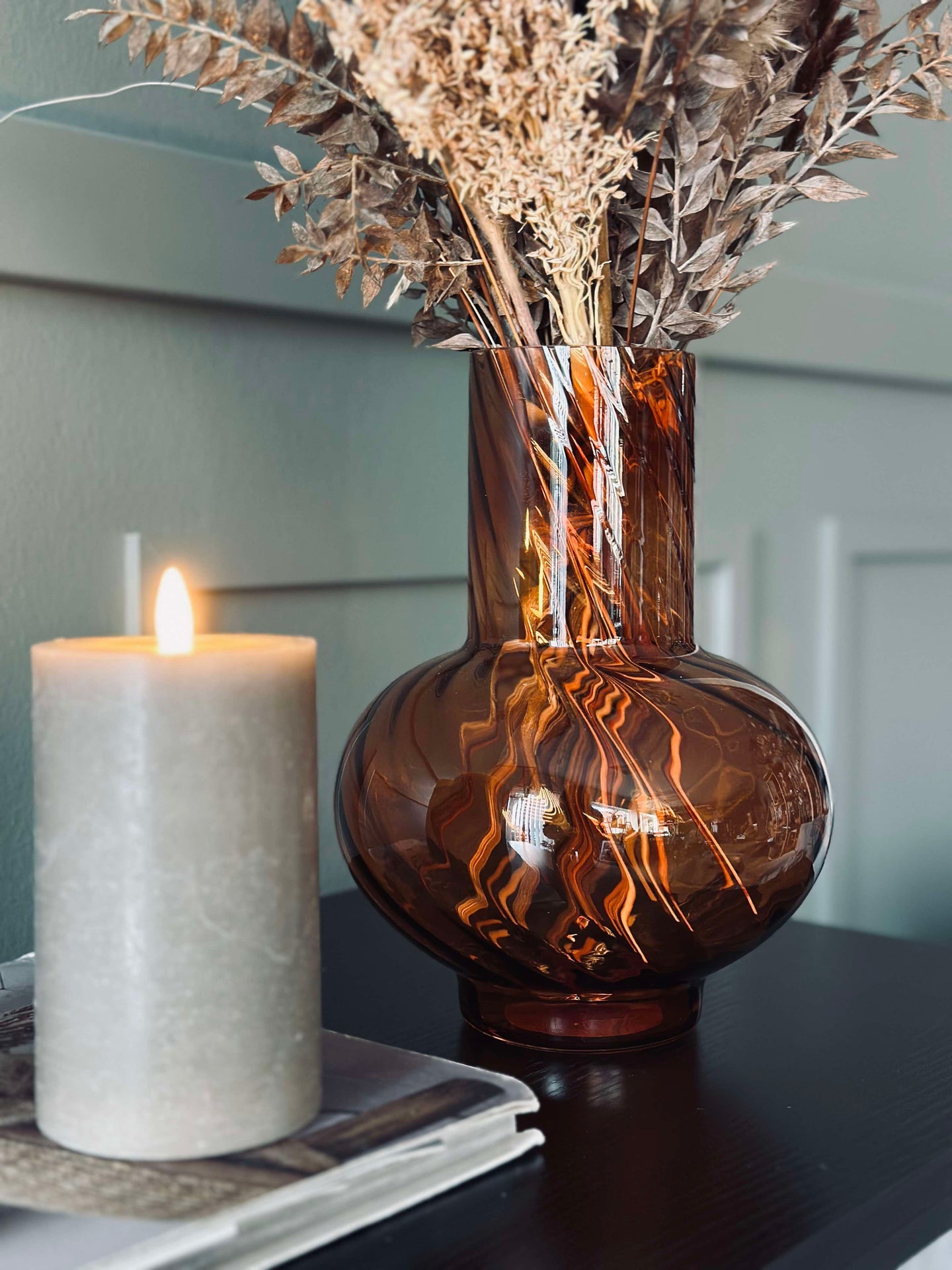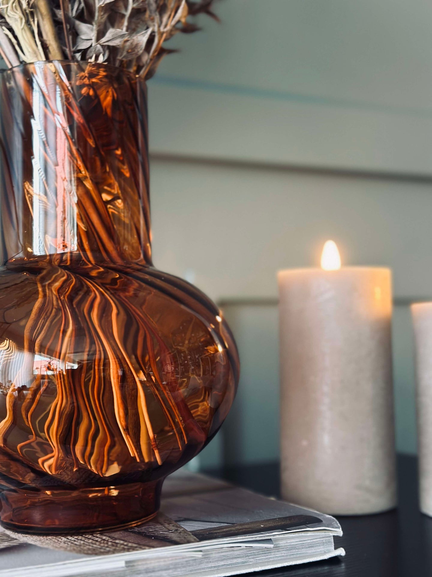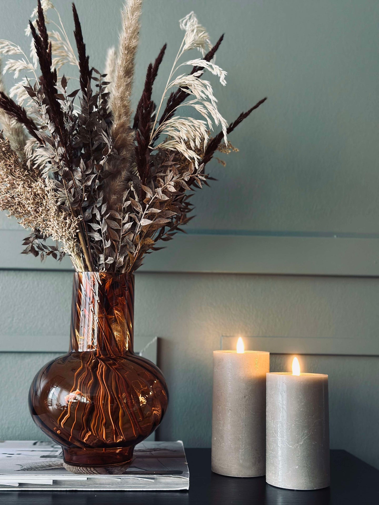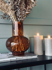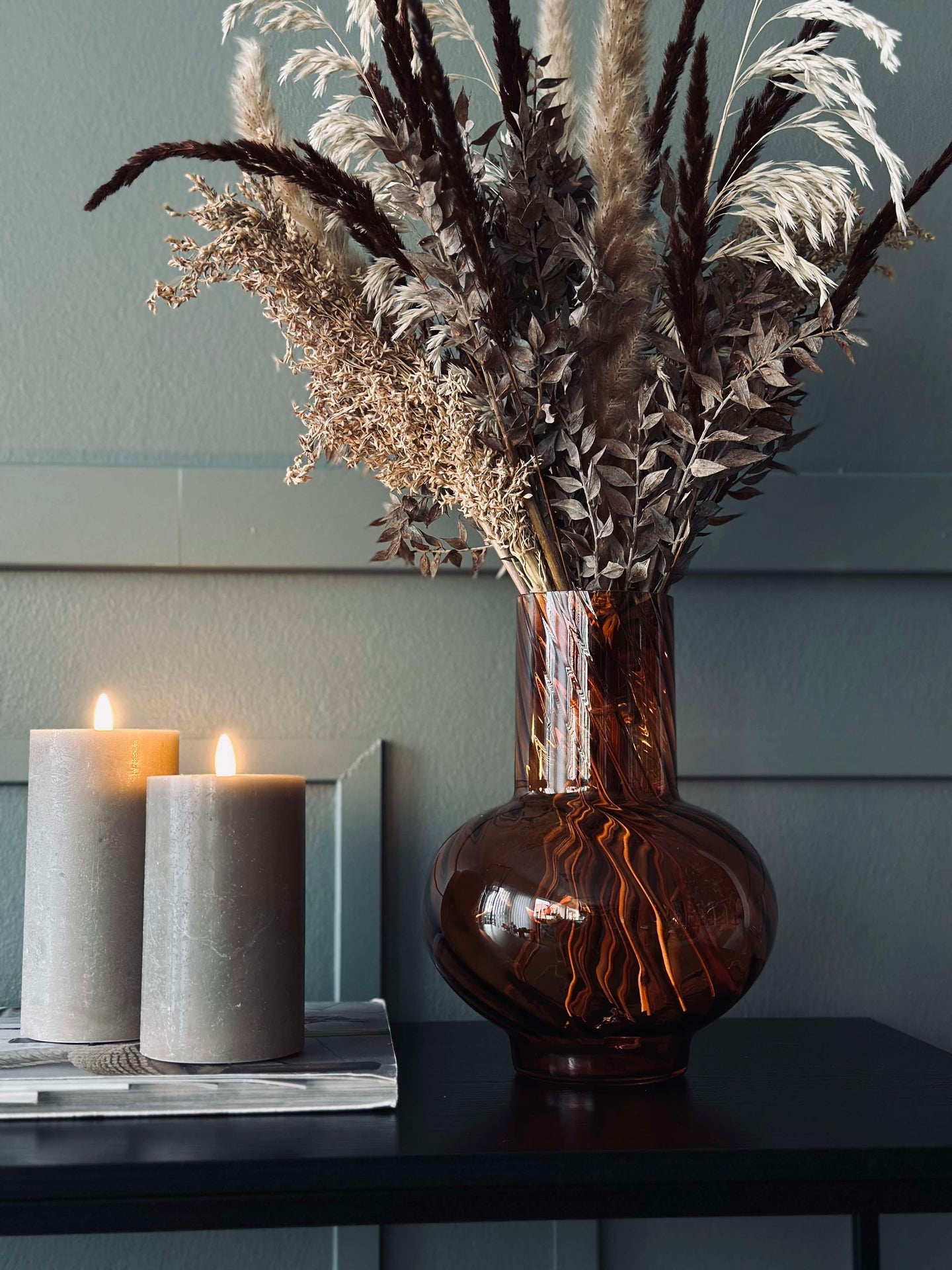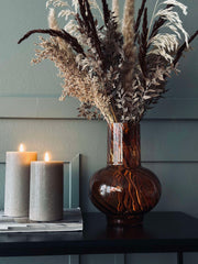 Glasvasen är tillverkad av gyllenfärgat glas, vilket ger en mjuk och varm ton till varje rum. Den gyllene nyansen reflekterar ljuset på ett behagligt sätt och skapar en inbjudande atmosfär. Denna färgkomposition gör att vasen smälter in harmoniskt med olika inredningsstilar och bidrar till en känsla av lyx och trivsel i ditt hem.