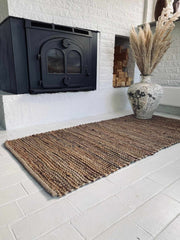 Skapa en oas av stil och funktion i ditt hem med vår bruna golvmatta i skinn och jute. Låt den ge ditt rum en unik touch samtidigt som den är praktisk och hållbar. Ge ditt hem det den förtjänar - beställ din golvmatta idag!