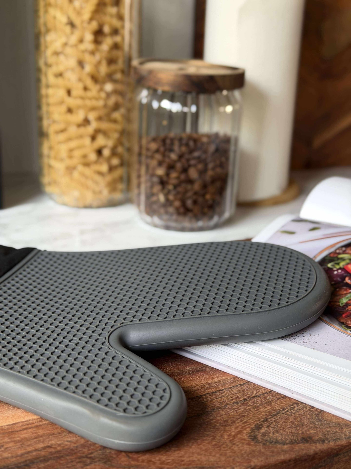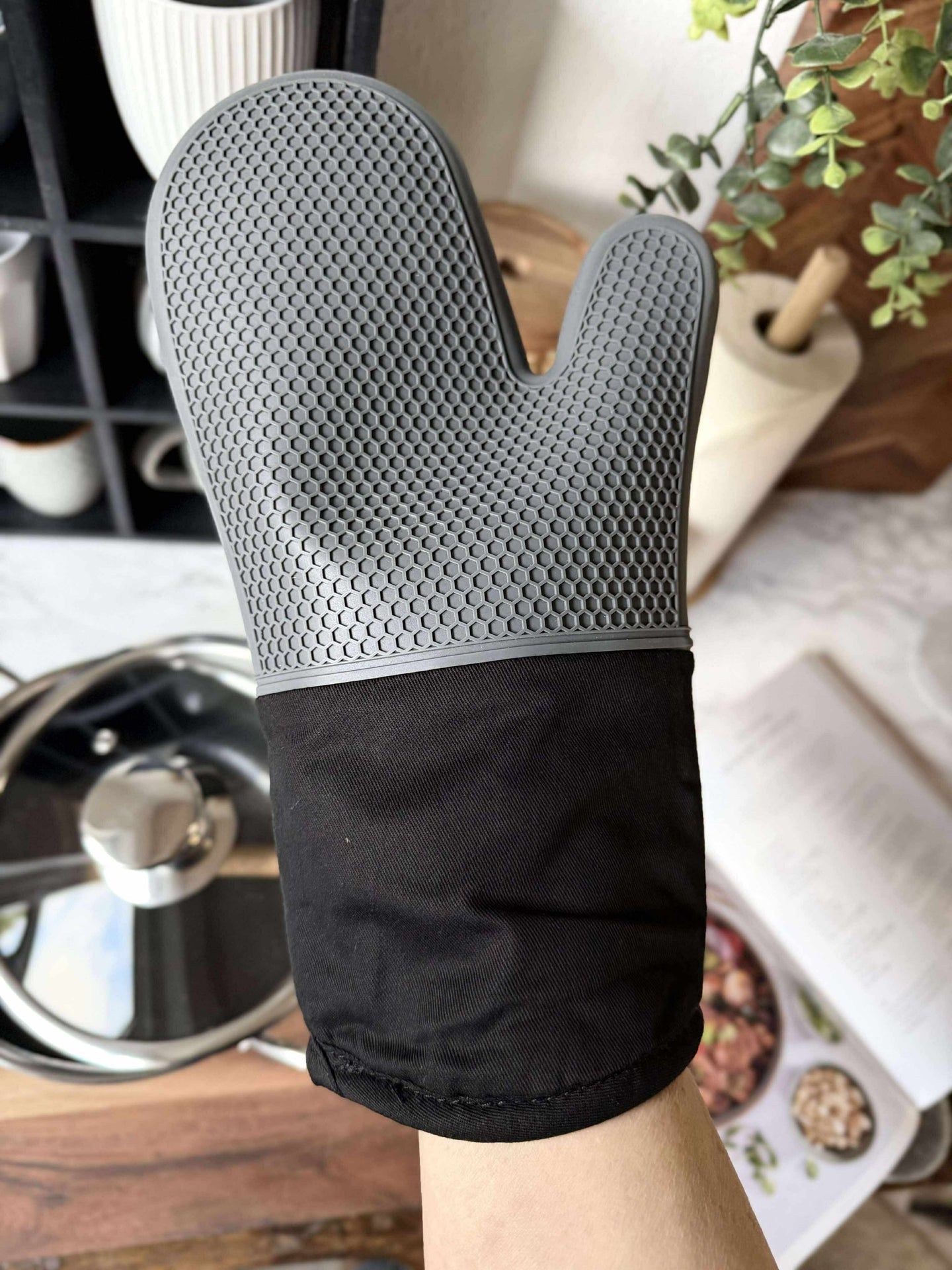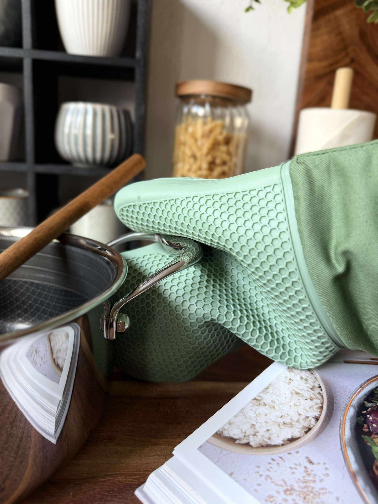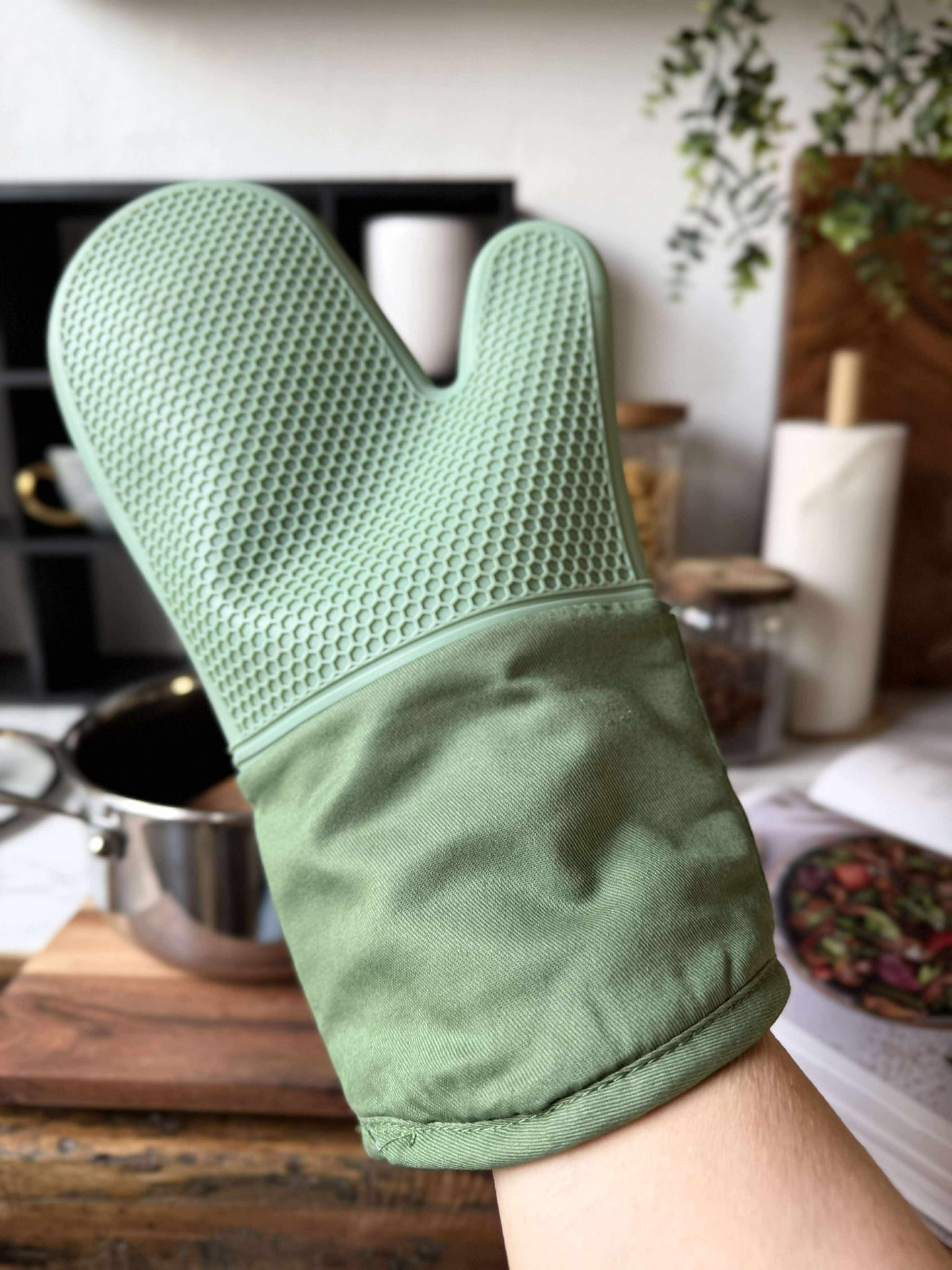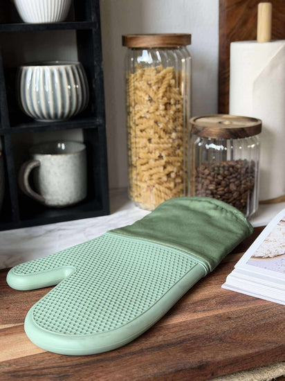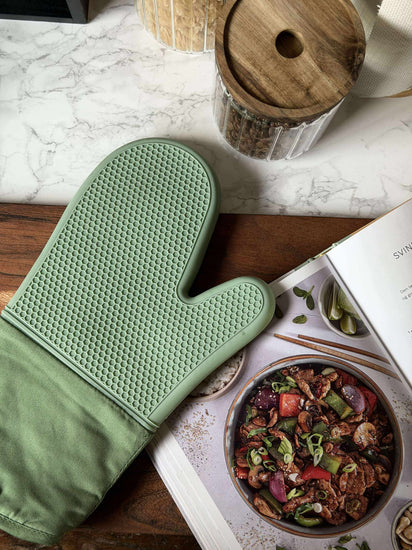 En grillvante av kraftig kvalitet som gör det enkelt att hantera varma formar och grilltillbehör i köket. Vanten är grön och kombinerar silikon med textil, så du får ett funktionellt grepp med ett lugnt, enkelt uttryck. Ytan har ett struktur/vävt mönster som ger ett bra grepp.