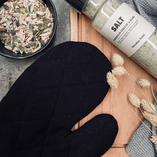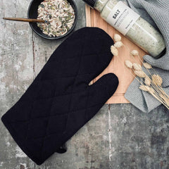 Denna svarta quiltade grillhandske är både praktisk och stilren. Den robusta konstruktionen signalerar funktionalitet och skydd, vilket gör den till ett utmärkt tillbehör för både grillning och köksbruk.