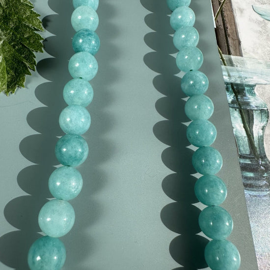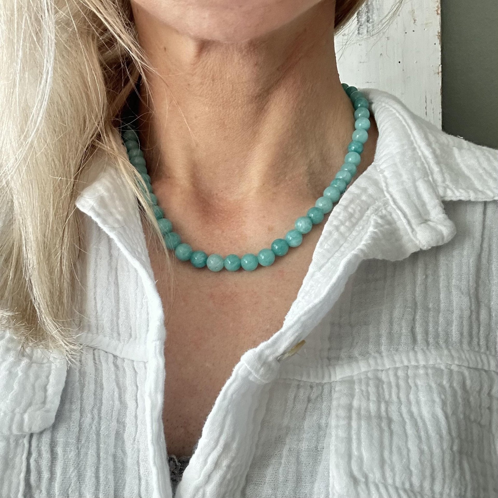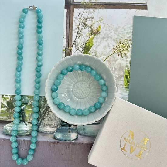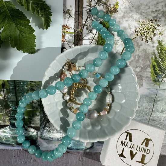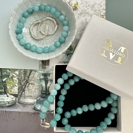 Detta halsband är tillverkat av vackra aqua naturstenar. Varje sten är noggrant utvald och har en diameter på 7 mm. Färgen på stenarna kan variera något, vilket ger varje halsband en speciell karaktär. Halsbandet i natursten kan bidra till en känsla av lugn och harmoni, samtidigt som det är en stilfull accessoar som passar till alla tillfällen.
