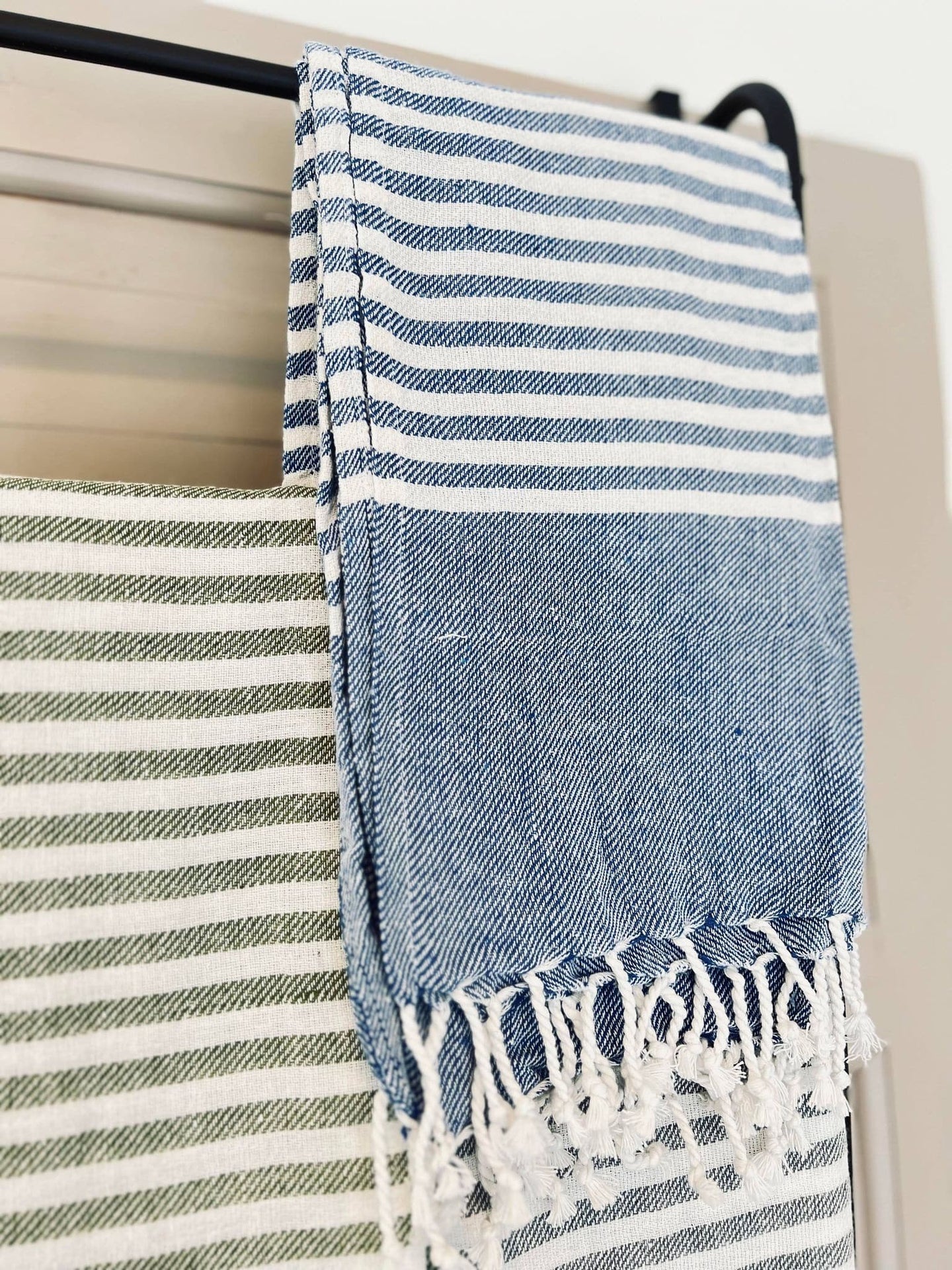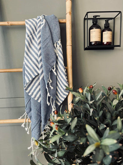 Vår Hammam-handduk i blått ger dig en otrolig torkupplevelse. Innan du använder den första gången, lägg handduken i kallt vatten i 24 timmar. Detta gör att bomullsfibrerna i handduken öppnar sig för att kunna absorbera vatten ännu bättre.