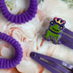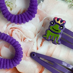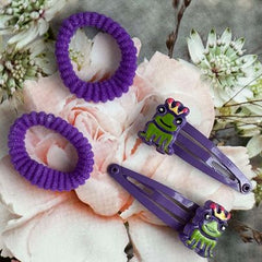 - Fint set i lila med tjocka elastiker och spännen med grodor