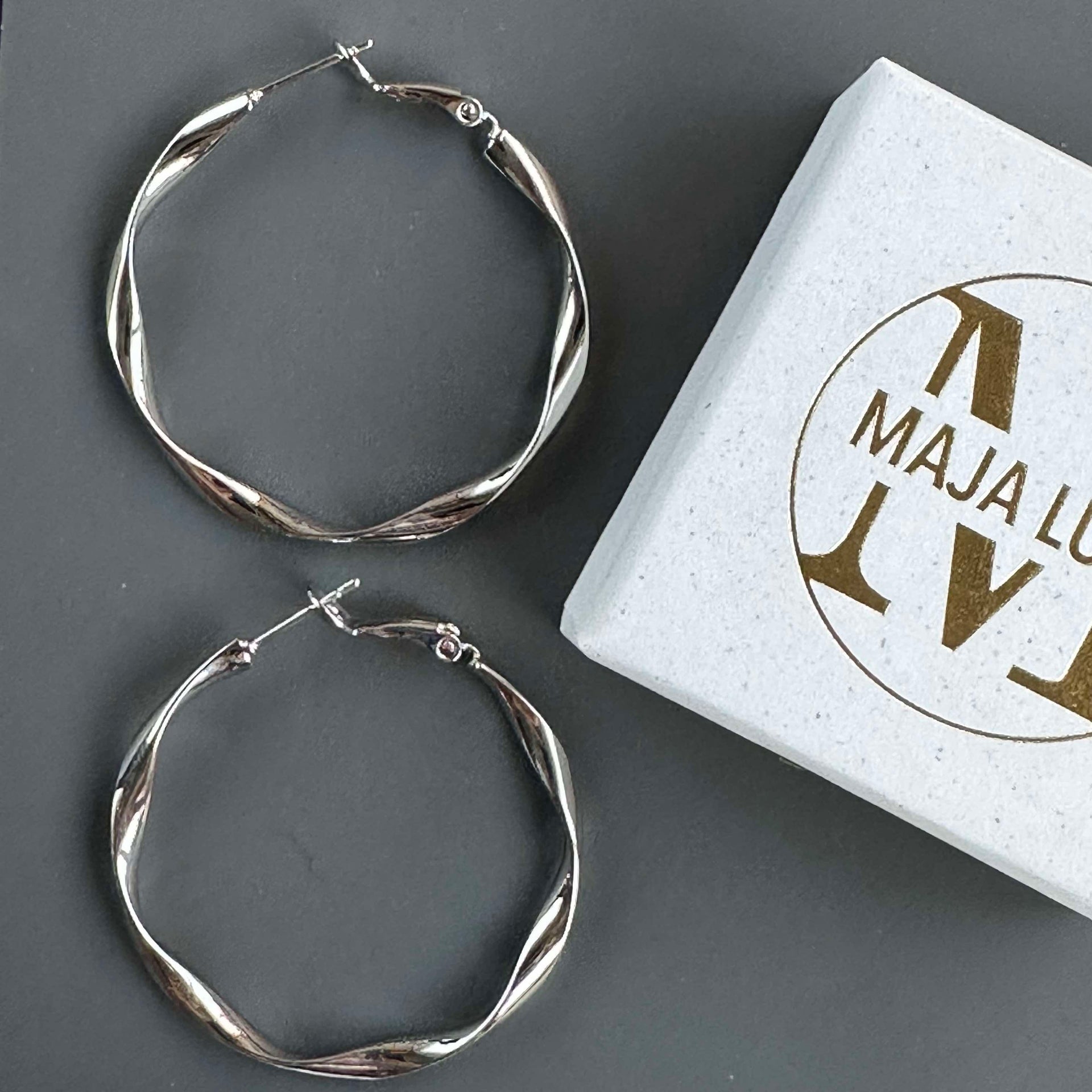 Dessa silverörhängen är belagda med äkta silver, vilket ger en distinkt och sofistikerad look. Silverbeläggningen förstärker inte bara örhängenas estetiska tilltalande, utan bidrar också till deras hållbarhet. Silverets lyster och elegans framhävs genom beläggningen, vilket gör örhängena till ett passande tillbehör för både vardagliga och speciella tillfällen. Dessutom är silver ett allergivänligt material, vilket gör dessa örhängen till ett bra val för de med känslig hud.