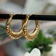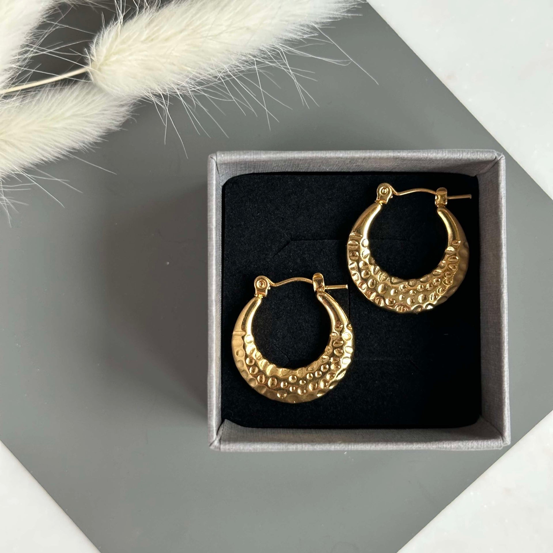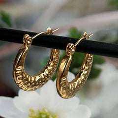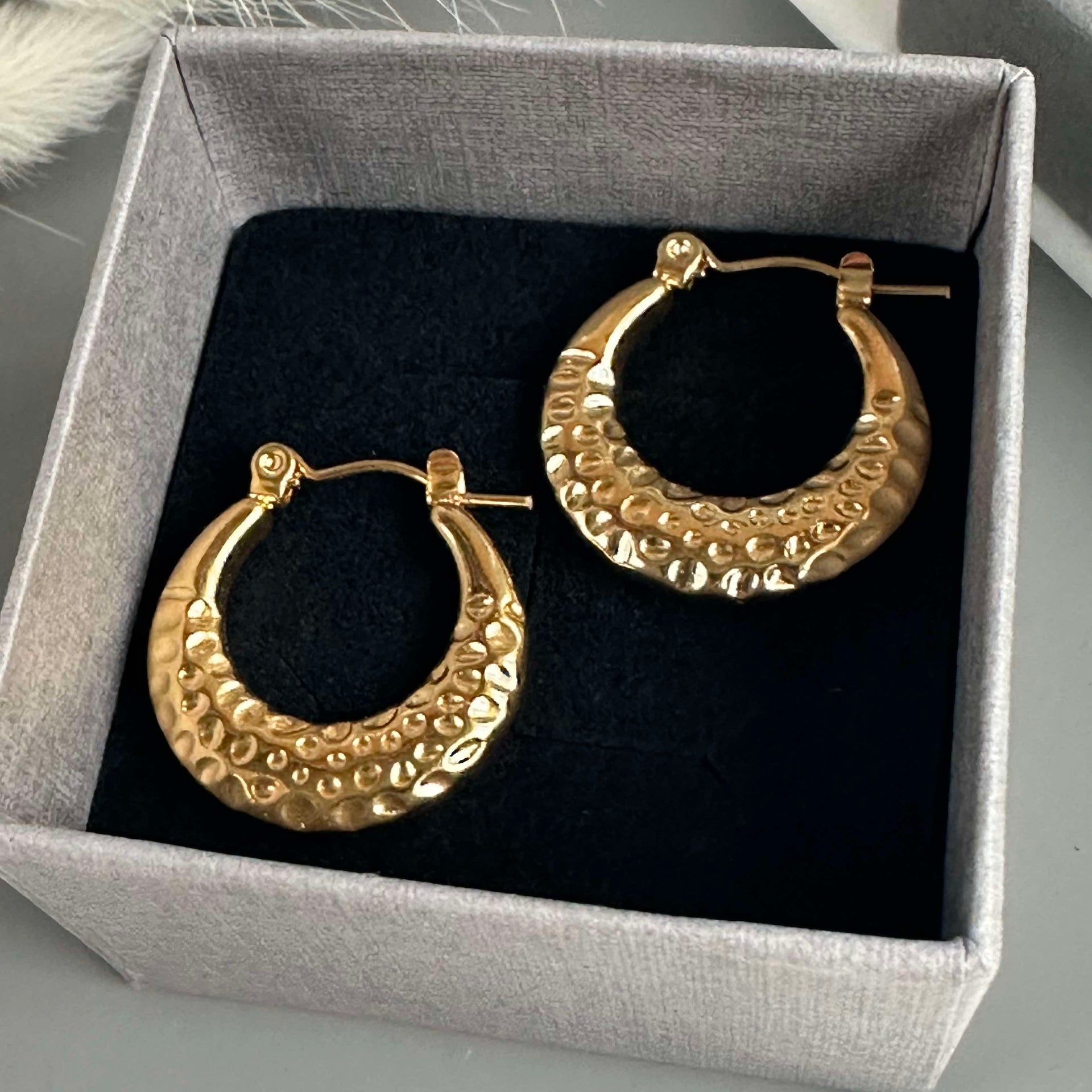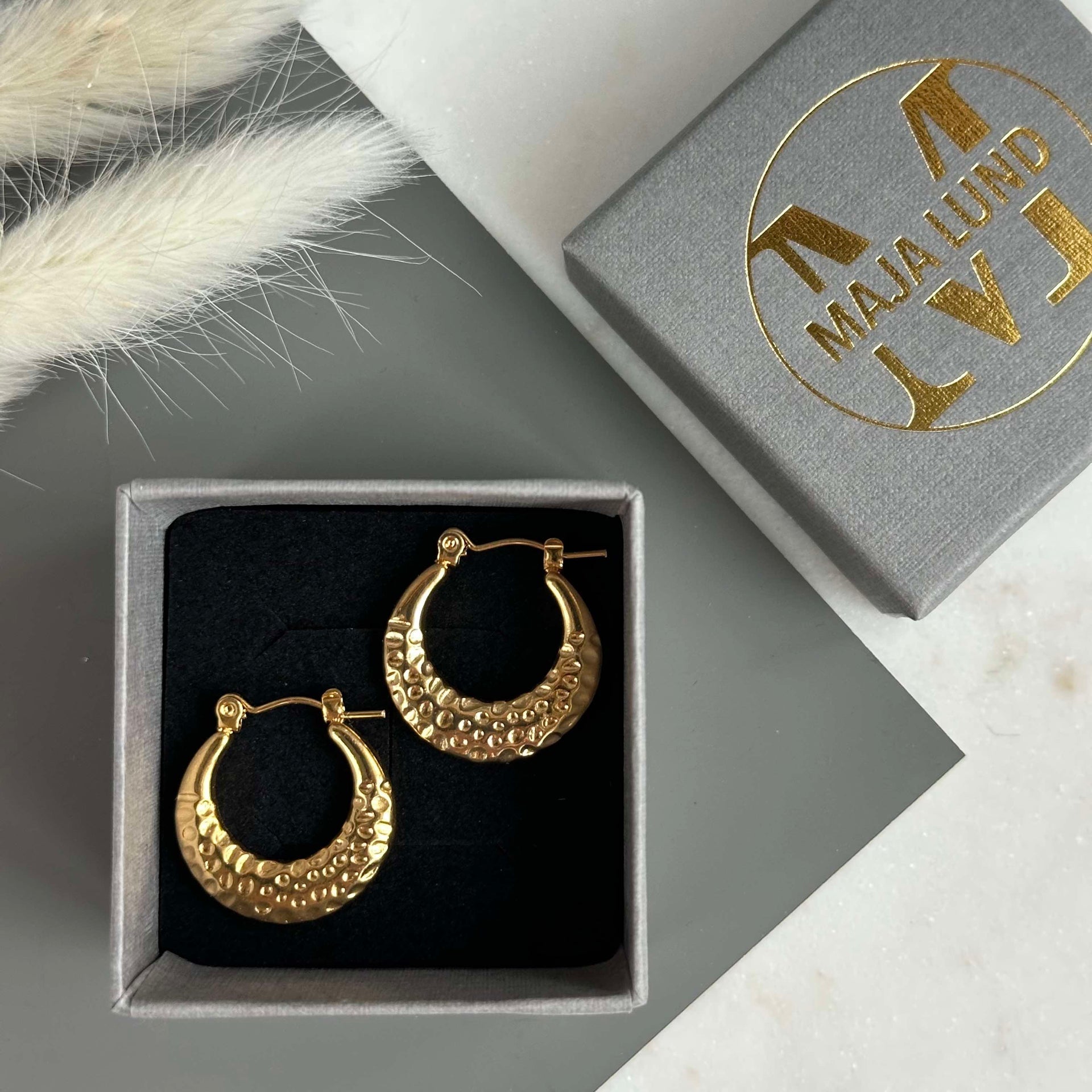 Örhängena är tillverkade av rostfritt stål, vilket innebär att de är hållbara och motståndskraftiga mot korrosion. Förgyllningen ger en varm och inbjudande lyster som förhöjer utseendet utan att kompromissa med kvaliteten. Dessa materialval gör att örhängena behåller sin skönhet över tid och är ett utmärkt val för dagligt bruk.