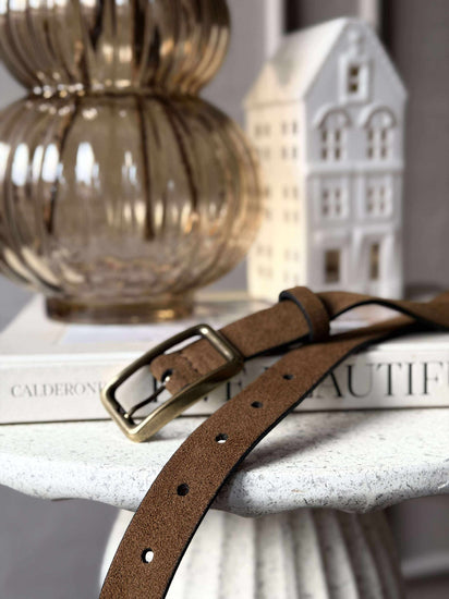 Jeansbälte - Mocka är ett klassiskt bälte i mjuk mocka med ett lugnt, enfärgat uttryck. Den bruna färgen gör det lätt att styla och tillför en varm, avslappnad prägel till din outfit. Ett tidlöst val när du vill ha en diskret men markant detalj.