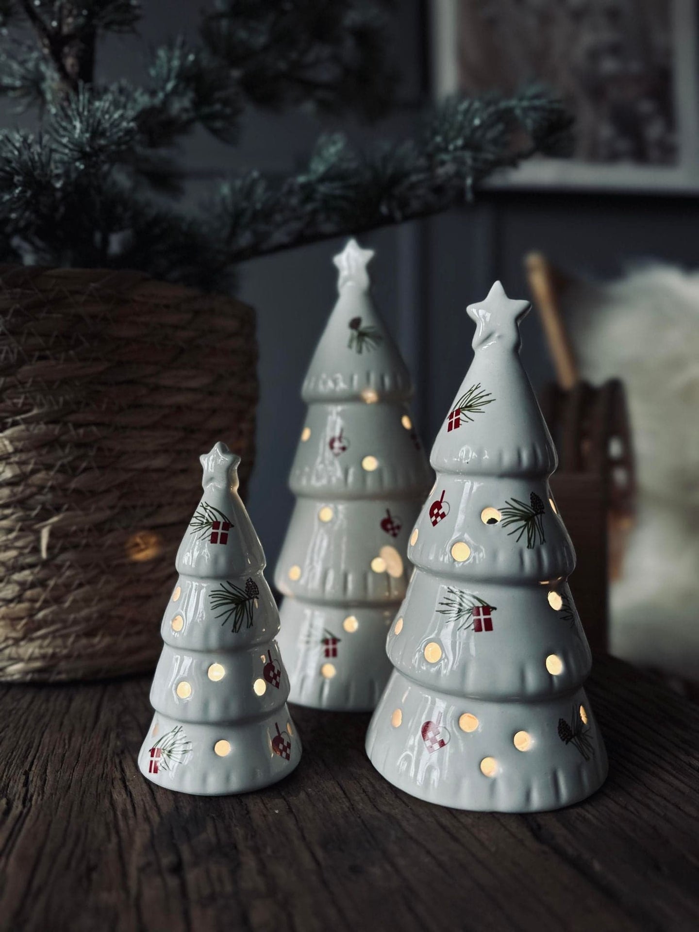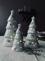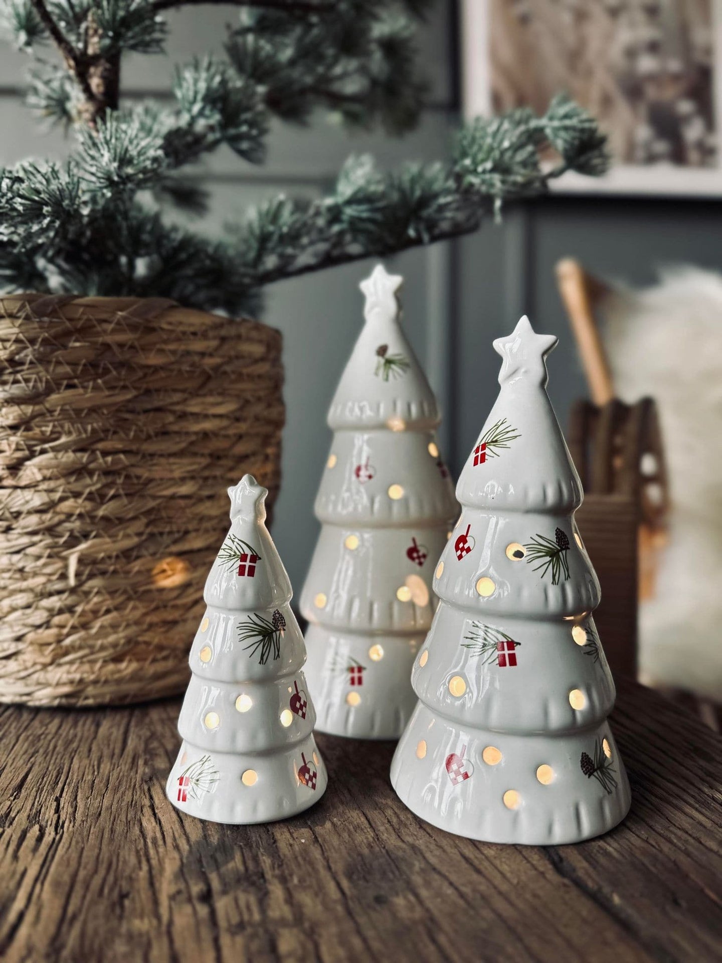 Förhöj julstämningen i ditt hem med dessa noga utvalda LED-belysade granar. Denna trio av vita keramikgranar erbjuder en subtil och stämningsfull belysning, perfekt för att skapa en mysig och inbjudande atmosfär under hela julfirandet.