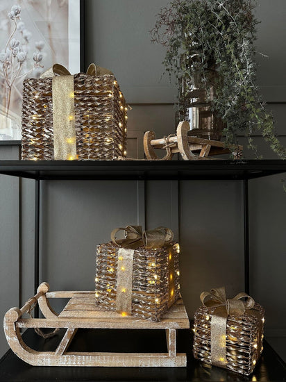 Denna dekorativa träkälke är tillverkad av noggrant tvättat trä, vilket ger den ett unikt och äkta utseende. Tvättprocessen framhäver träets naturliga skönhet och ger kälken en attraktiv lyster. Träkälken är inte bara ett roligt vinterredskap, utan också ett charmigt inslag i heminredningen som bidrar till en mysig och julig atmosfär. Den kan placeras framför brasan, användas som en originell bokhylla eller bara vara en vacker prydnad i sig själv.