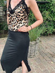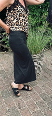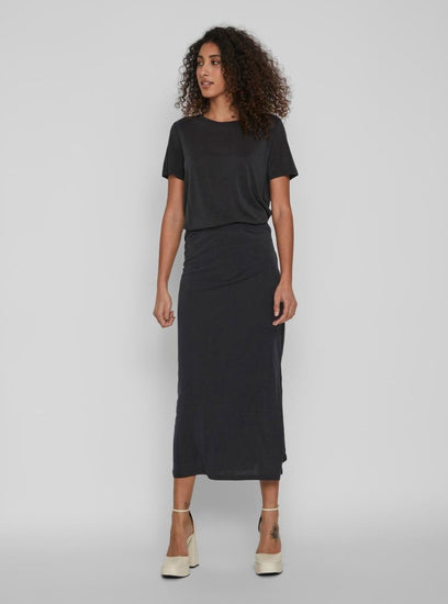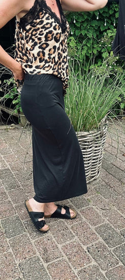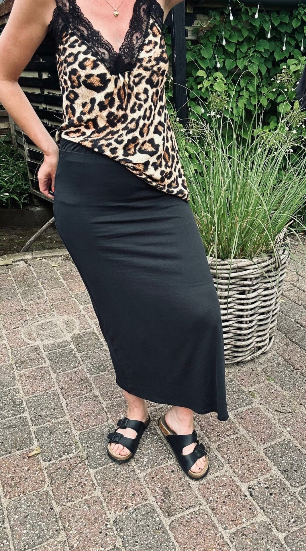 Maxinederdelen är tillverkad av en högkvalitativ blandning av 70% TENCEL™ Modal och 30% polyester. Denna kombination ger plagget en mjuk och behaglig känsla mot huden. TENCEL™ Modal är känt för sin utmärkta andningsförmåga, vilket gör att du känner dig fräsch och bekväm hela dagen. Polyesterblandningen adderar hållbarhet och gör nederdelen lätt att sköta.