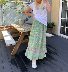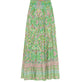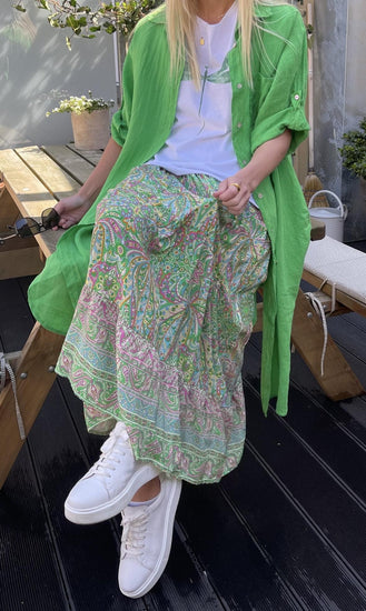 Denna gröna kjol är tillverkad av 100 % viskos, vilket ger den en mjuk och behaglig känsla mot huden. Viskos är ett andningsbart material som bidrar till en sval och bekväm upplevelse, vilket gör kjolen idealisk för varma sommardagar. Dessutom är viskos känt för sin hållbarhet, vilket innebär att kjolen behåller sin kvalitet och färg även efter flera tvättar.