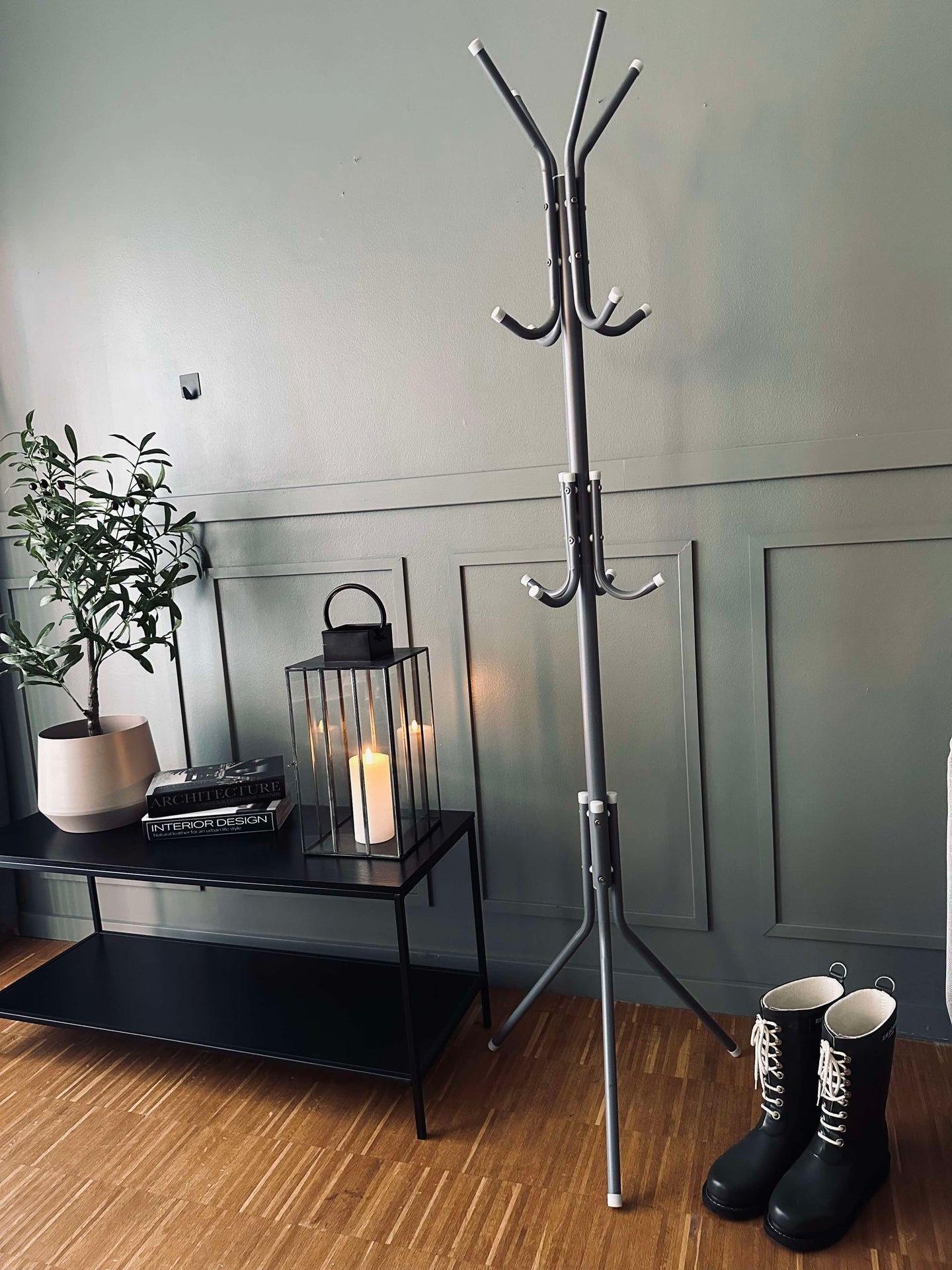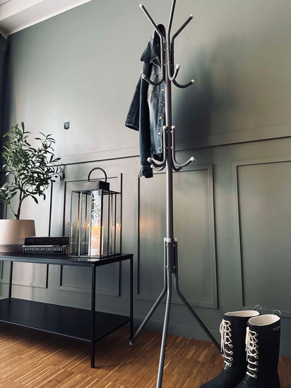 Klädhängaren, tillverkad av lätt metall, erbjuder en praktisk lösning för hallförvaring. Den lätta konstruktionen gör den enkel att flytta och omplacera efter behov, utan att kompromissa med stabiliteten. Den metalliska ytan ger en modern känsla som passar in i de flesta interiörer. Dessutom underlättar den låga vikten vid montering och demontering, vilket sparar tid och ansträngning.