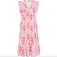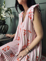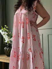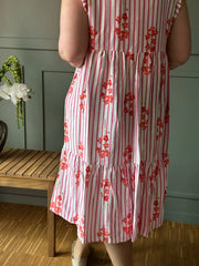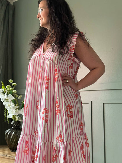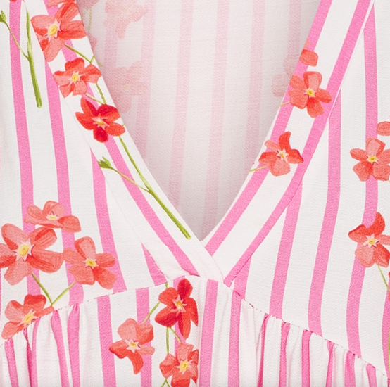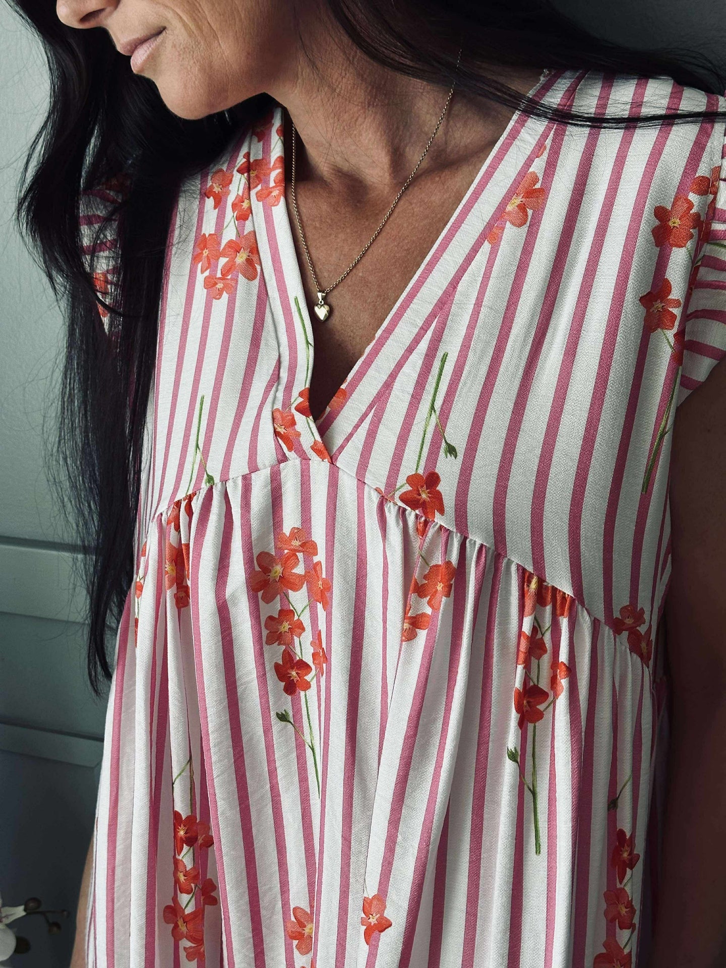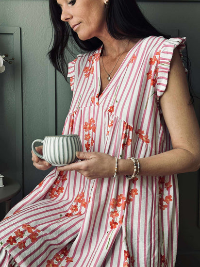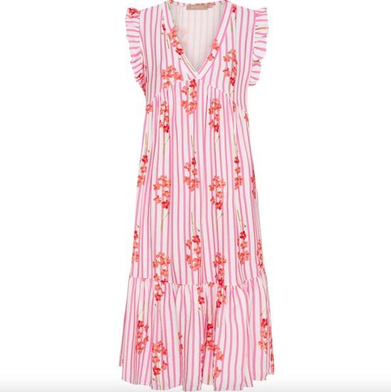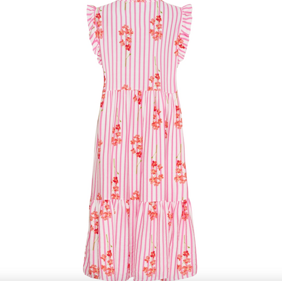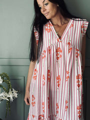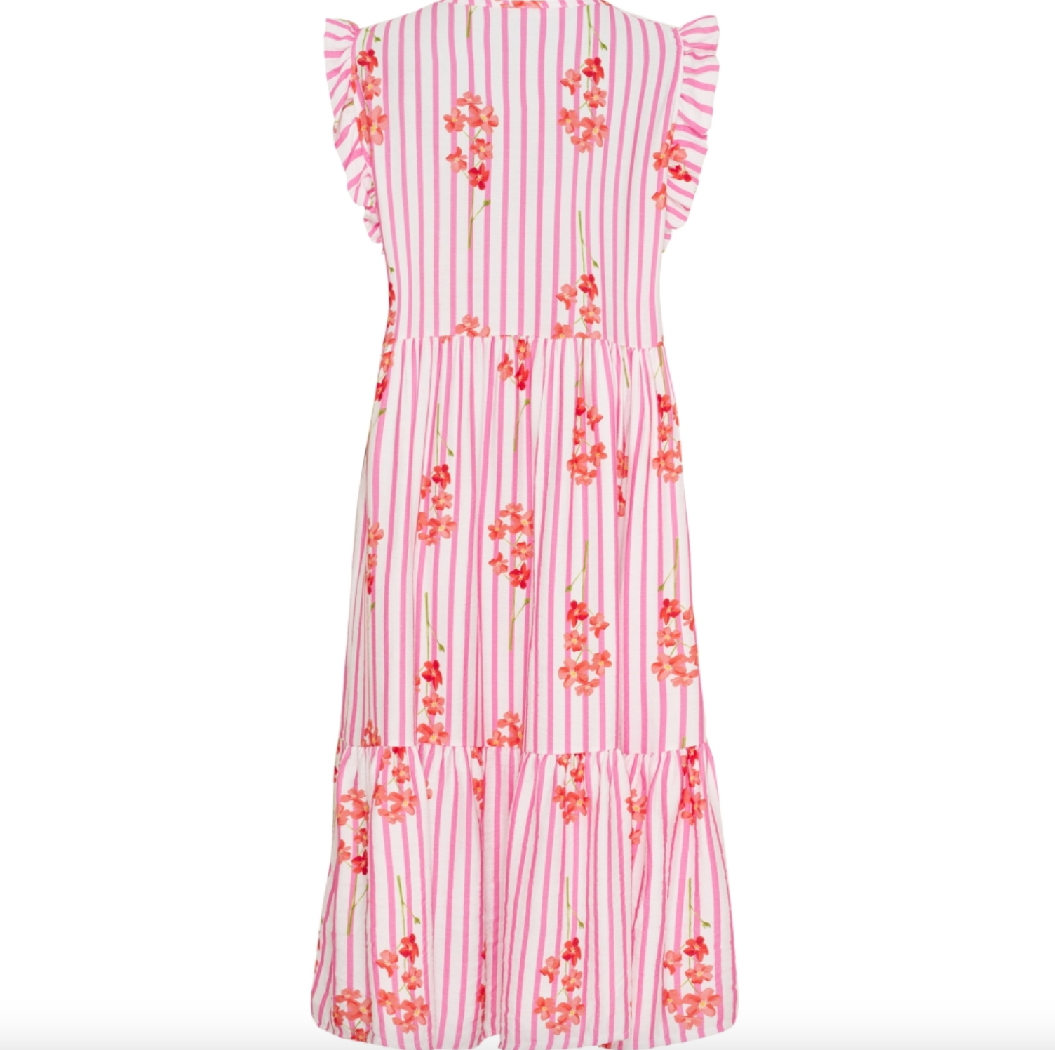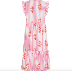 Denna sommarklänning är tillverkad av 100 % viskos, vilket ger en mjuk och behaglig känsla mot huden. Viskosens naturliga andningsförmåga gör att klänningen är sval och skön under varma sommardagar. Materialet faller elegant och ger en avslappnad men stilren look. Dessutom är viskos lätt att underhålla och behåller sin form tvätt efter tvätt, vilket gör det till ett praktiskt val.