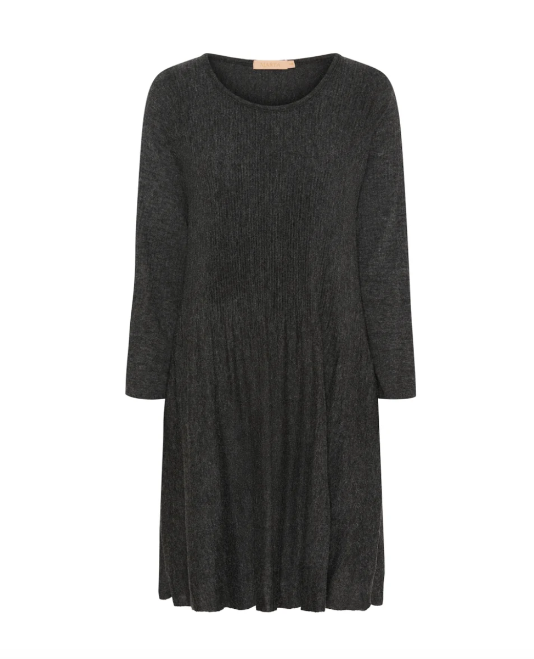 Den grå klänningen är tillverkad av en kombination av viskos, ull och elastan, vilket ger en mjuk och bekväm känsla. Viskosen bidrar till ett lätt och luftigt tyg, medan ullen ger värme och hållbarhet. Elastan ger klänningen en flexibel passform som anpassar sig efter kroppens rörelser. Denna materialblandning säkerställer både komfort och stil.
