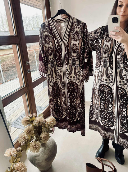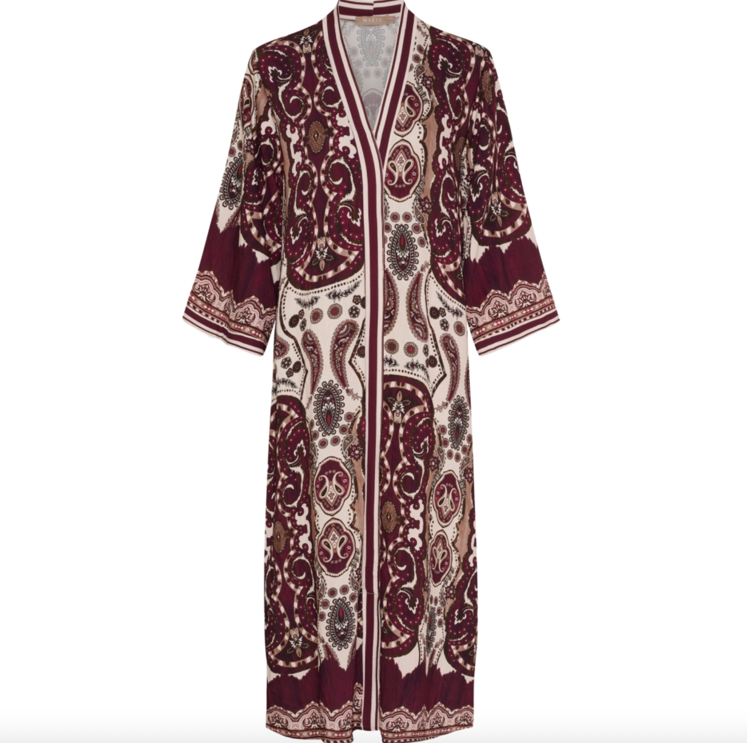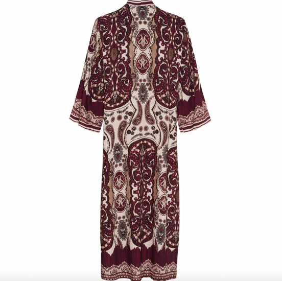 Klänning Vino är en elegant klänning som kan användas både till vardag och fest. Den är tillverkad i viskos och har V-ringning samt regular passform. Den röda, tryckta designen ger klänningen ett markant och feminint uttryck.