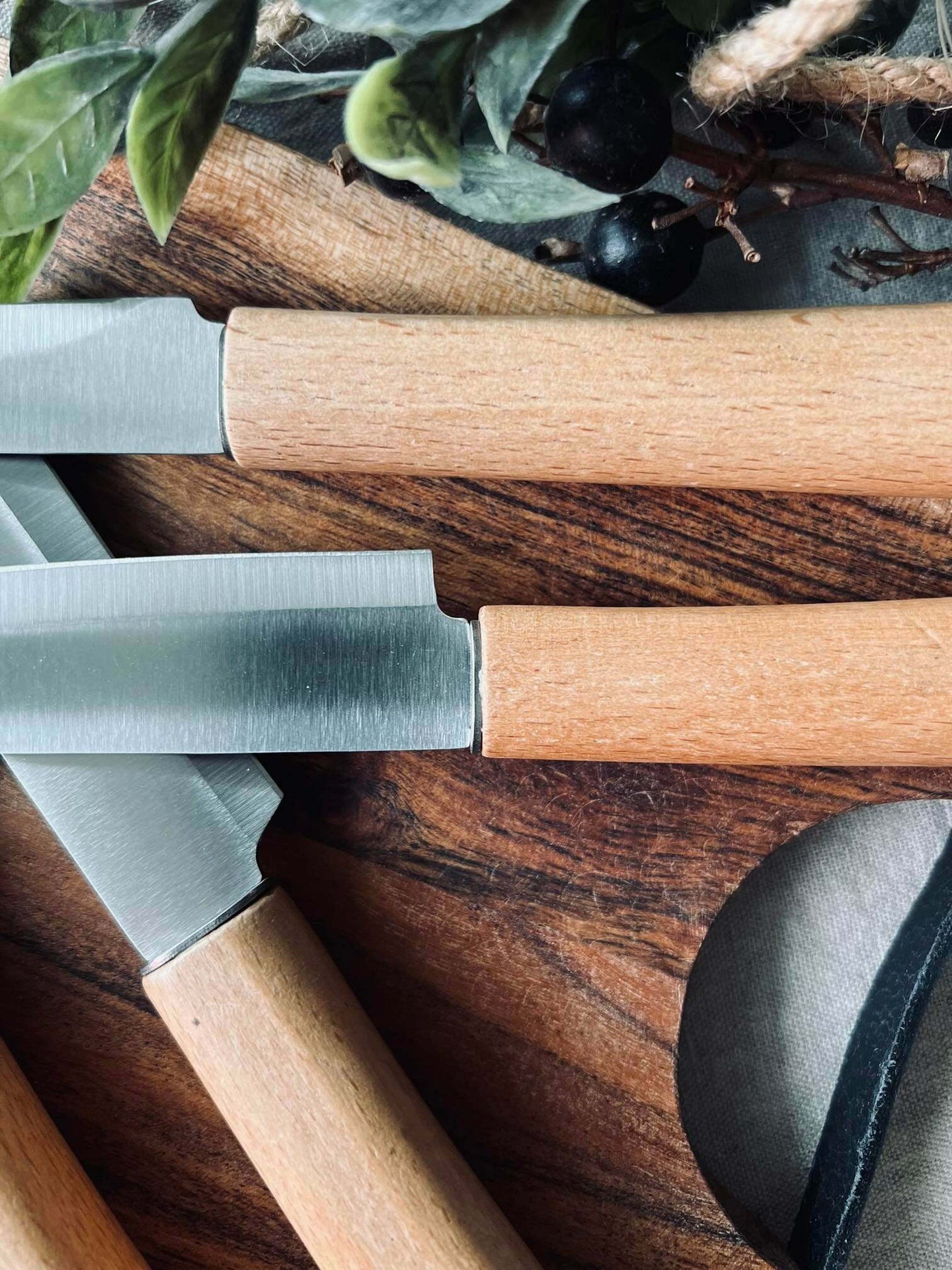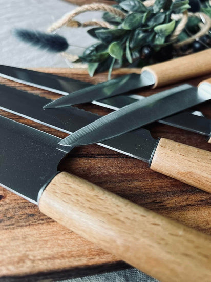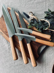Du får ett elegant knivset med fem olika knivar. Varje kniv har ett smakfullt bokträskaft och ett grått blad av rostfritt stål. Kombinationen av färger och material ger en modern och naturlig estetik. För att säkerställa en längre livslängd rekommenderar vi att du inte använder diskmaskin.