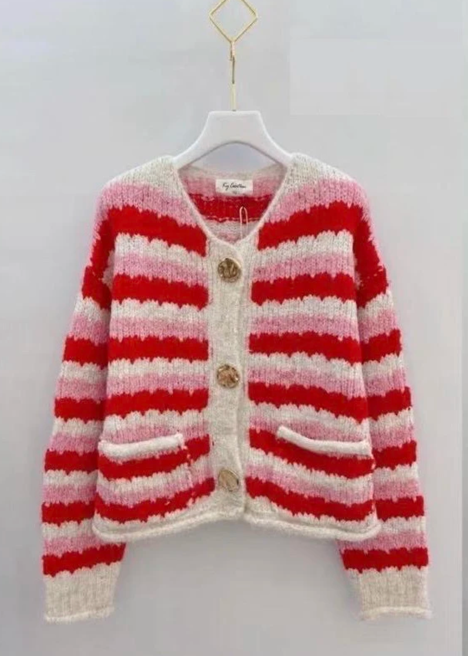 Cardiganen är tillverkad i polyester och har ett randigt mönster som framhäver det rena, grafiska utseendet. Den röda färgen och de gyllene knapparna ger en markant, men ändå elegant kontrast.