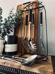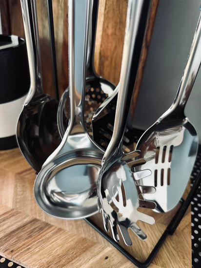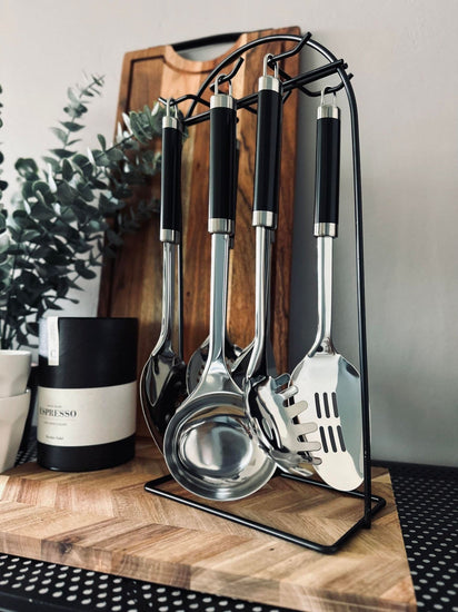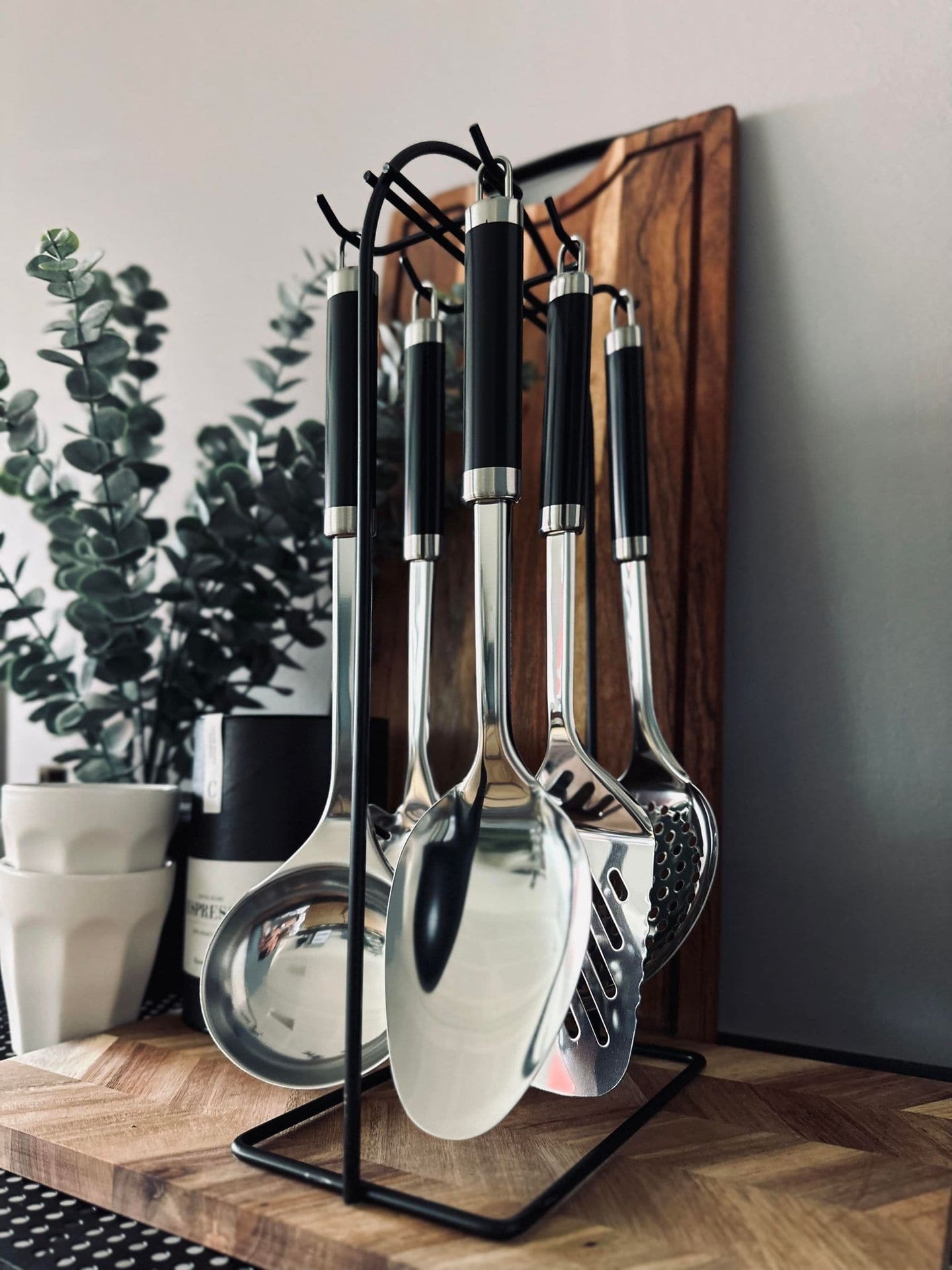 Denna köksredskapshängare kommer med sex praktiska köksredskap: en slev, en sked, en stekspade, en pastaslev, en visp och en skumsked. Varje redskap har sin egen dedikerade plats på hängaren, vilket hjälper till att hålla dina köksredskap organiserade och lättillgängliga. Detta förbättrar din köksmiljö och effektiviserar matlagningen.