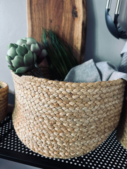 Ge dina skönhetsprodukter ett stilfullt hem och håll dem organiserade med vår Korg i Jute - Stor. Skapa ett lugnande och organiserat utrymme för dina värdefulla tillhörigheter idag!