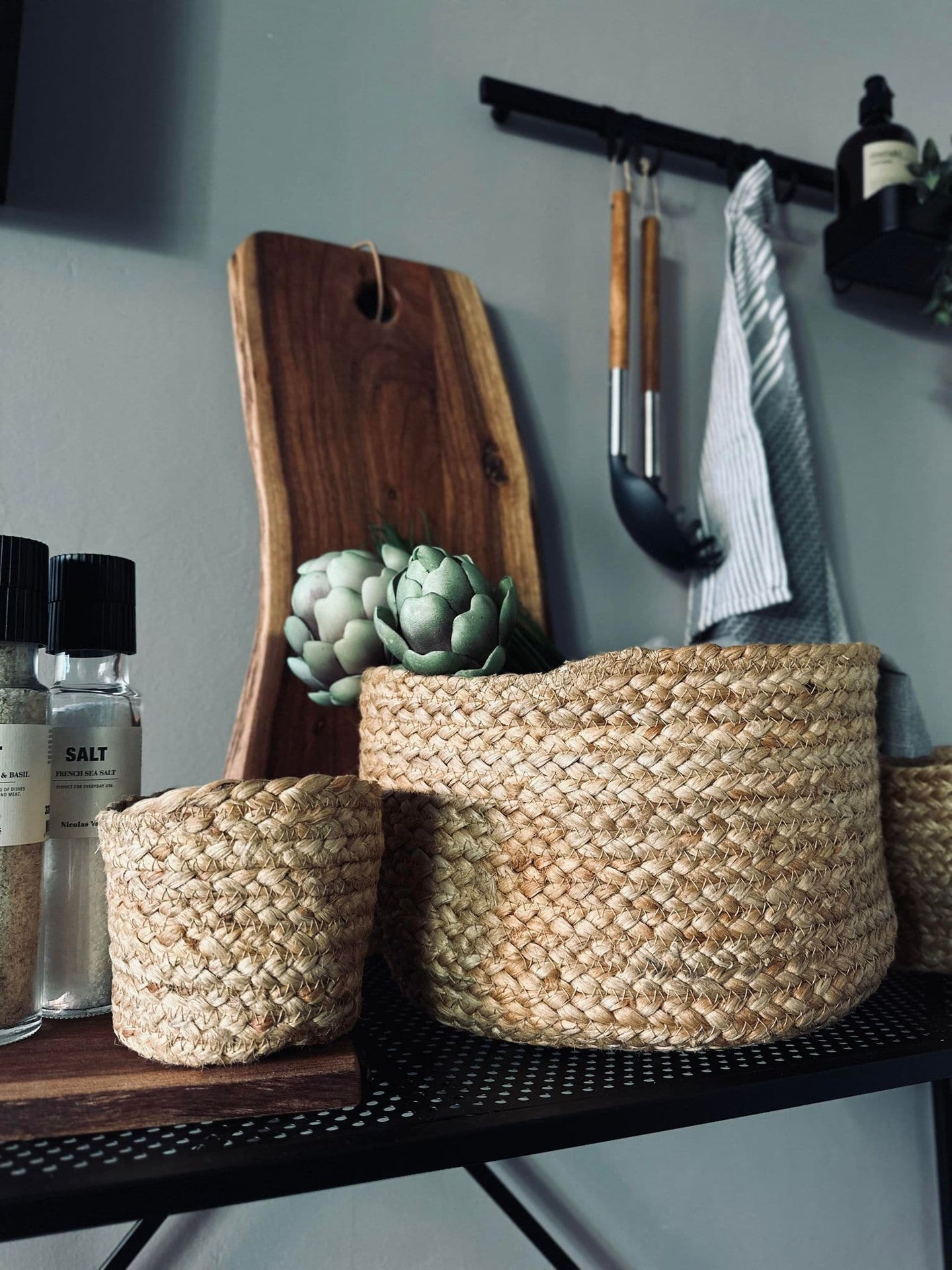 Vår jutekorg har dimensioner på 28 cm i diameter och 18 cm i höjd. Dessa mått gör den till en idealisk förvaringslösning för ditt hem. Du kan enkelt placera den på en hylla, i ett skåp eller på golvet. Den är tillräckligt stor för att rymma olika objekt, samtidigt som den är kompakt nog att inte ta upp för mycket utrymme. Denna jutekorg bidrar till en organiserad och stilfull inredning.
