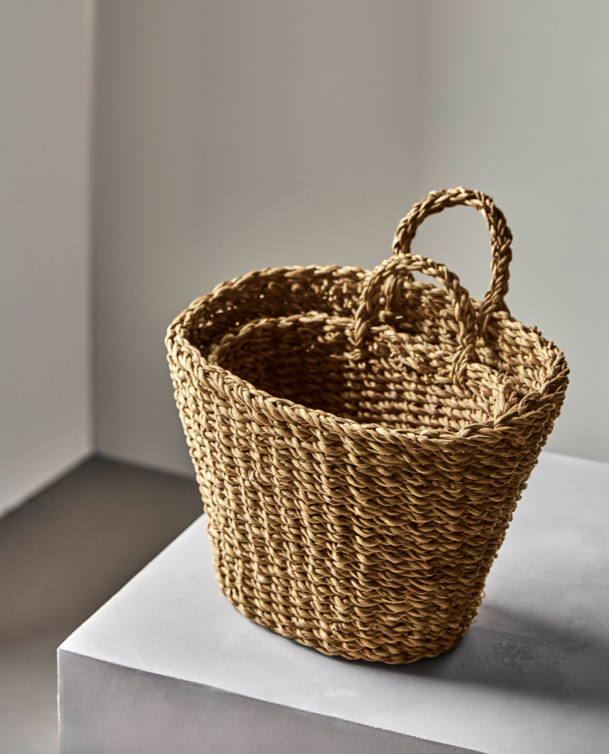 Dessa korgar är tillverkade av 100 % äkta sjögräs, vilket ger en naturlig och jordnära känsla till ditt hem. Materialets hållbarhet och flexibilitet gör det enkelt att väva vackra och praktiska former. Dessutom är sjögräs ett förnybart och miljövänligt alternativ, vilket bidrar till ett hållbart levnadssätt samtidigt som det tillför en varm och inbjudande atmosfär.