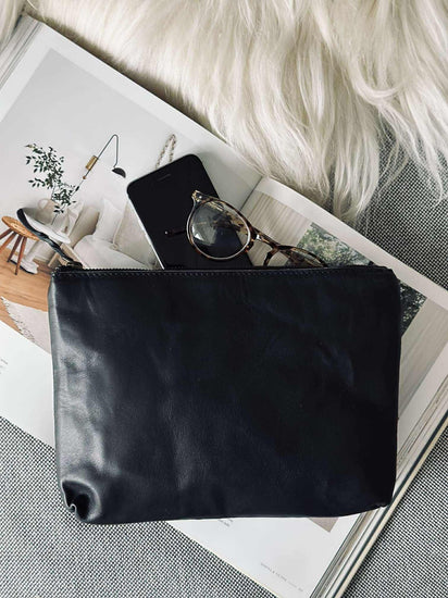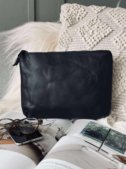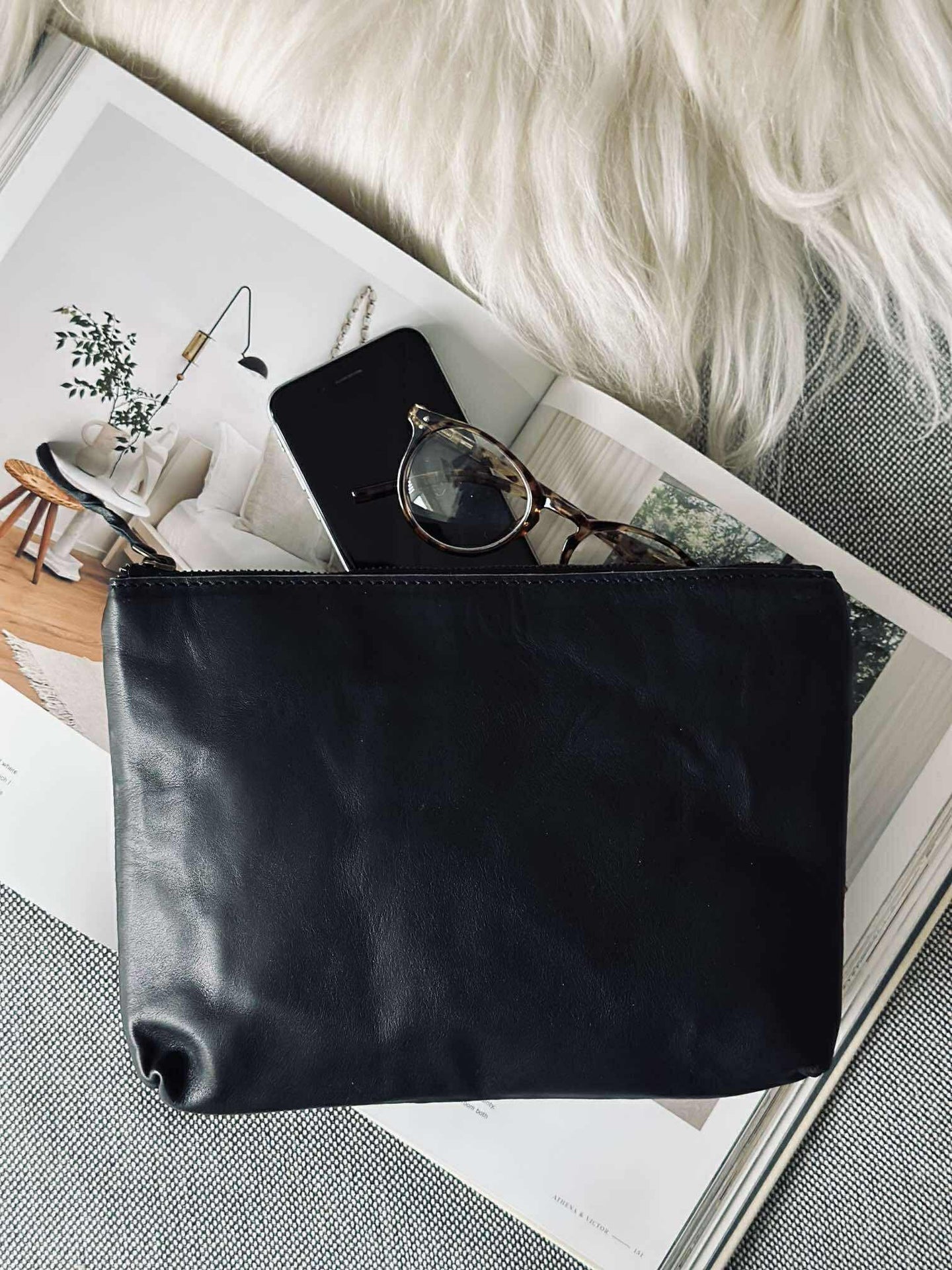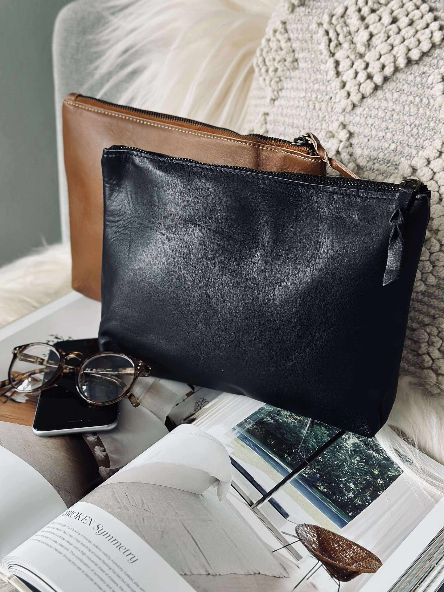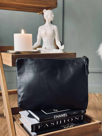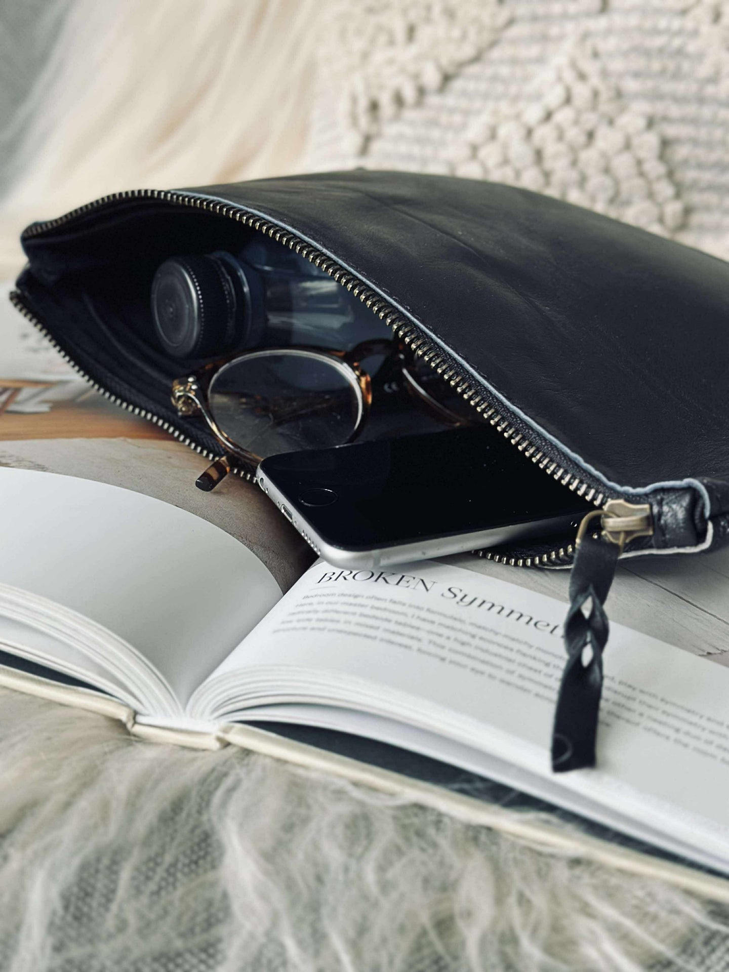 När du behöver organisera dina skönhetsartiklar utan att ta upp för mycket plats, erbjuder denna svarta läderväska en stilren lösning. Den är lätt att bära med dig i din väska och ger praktisk förvaring utan krångel.