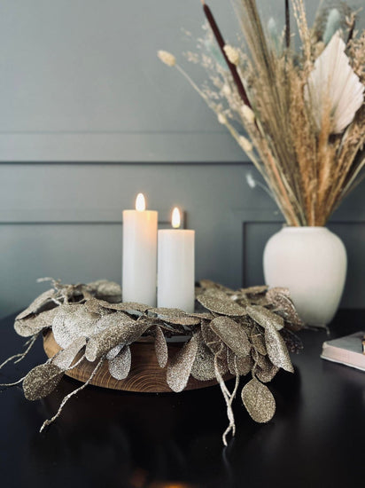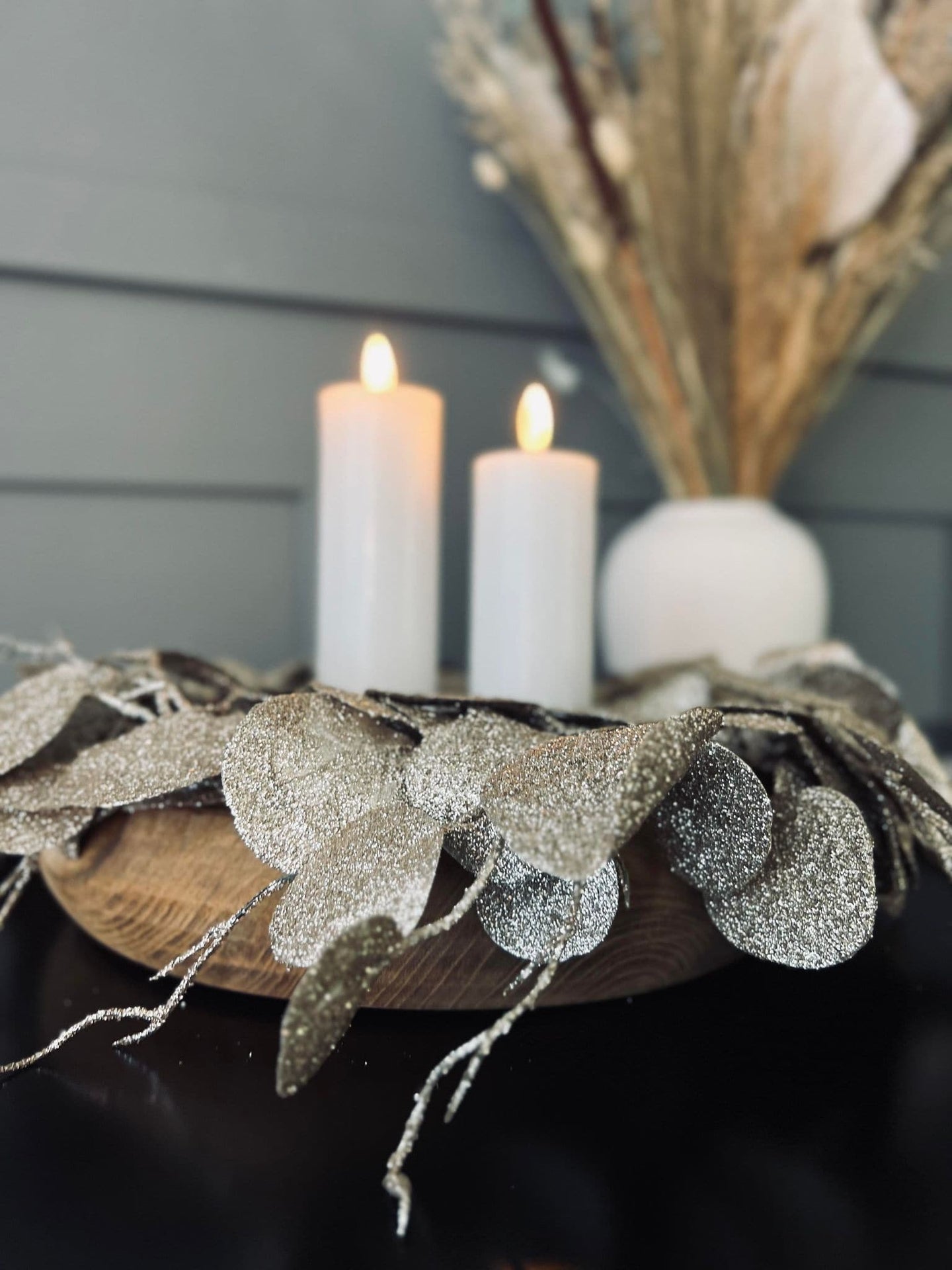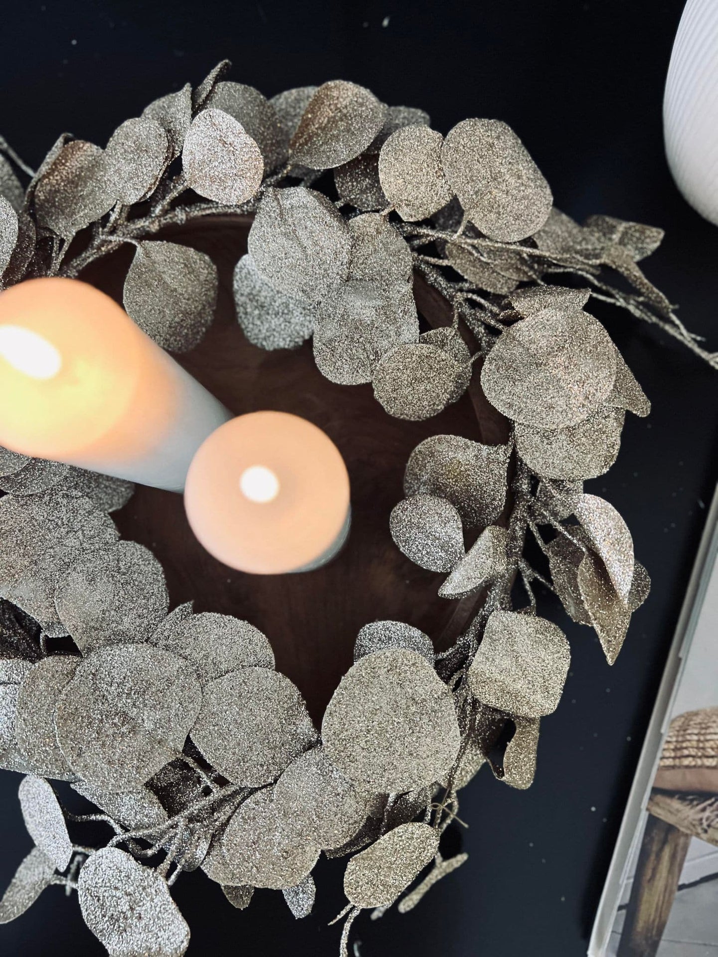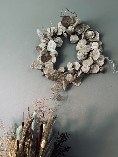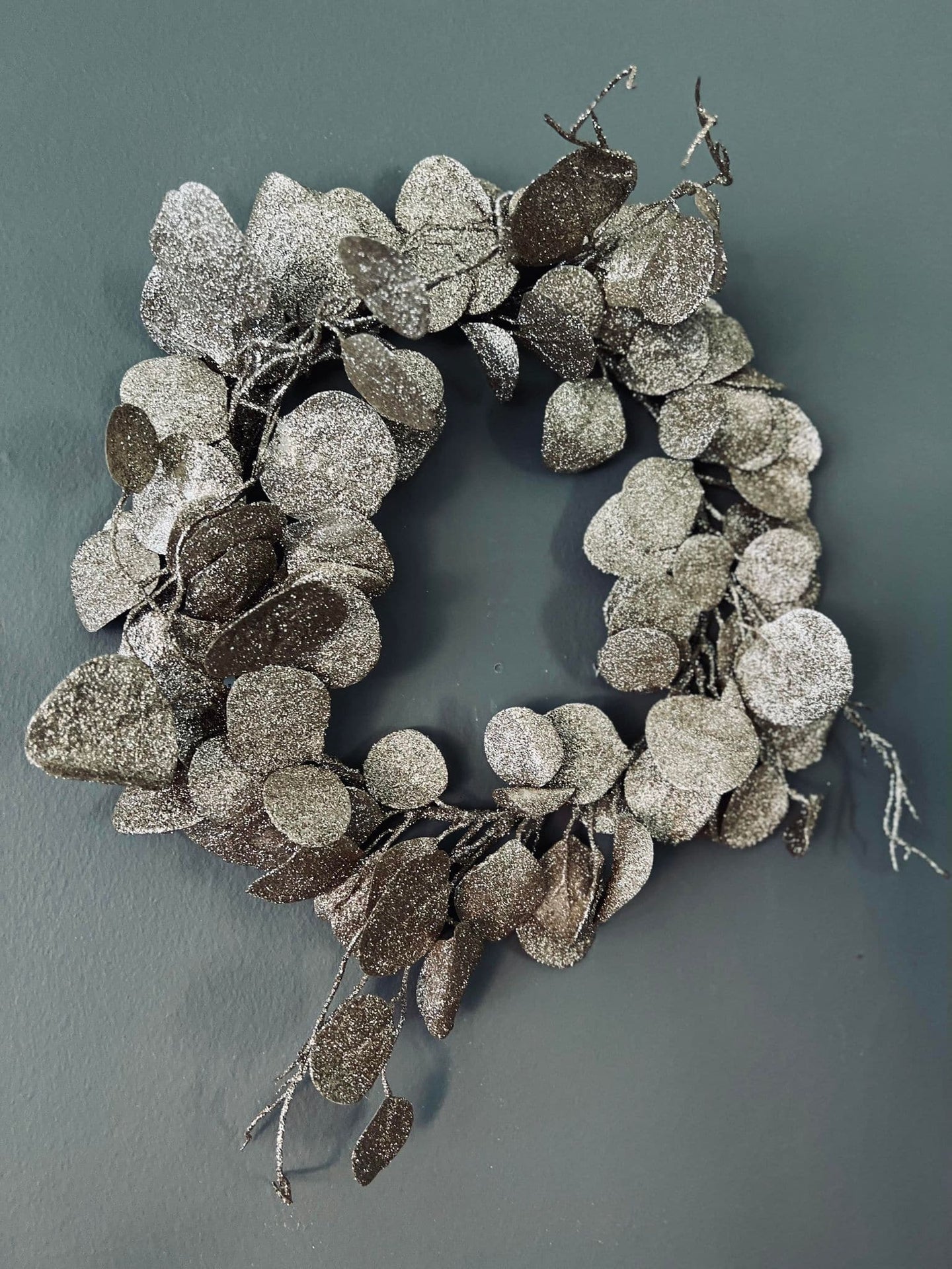 En dekorativ och glittrande krans, perfekt för att skapa en festlig atmosfär i ditt hem. Kransen är gjord med glitter för att ge ett extra skimmer och en känsla av lyx. Den är lätt att hänga och kommer att bli en vacker detalj i ditt rum.