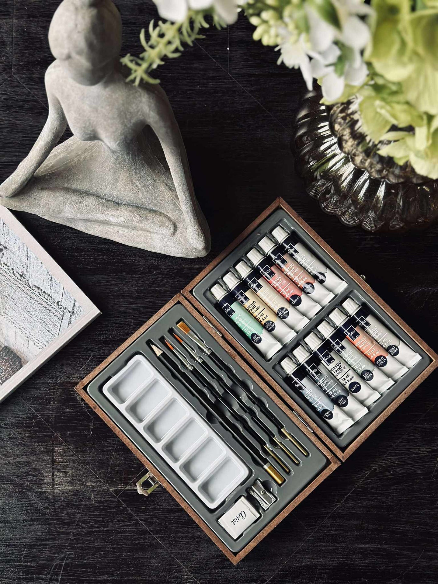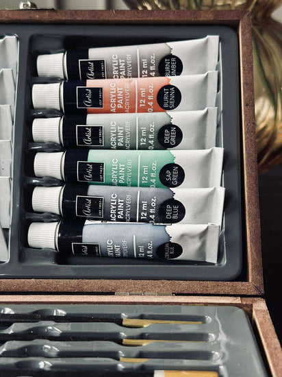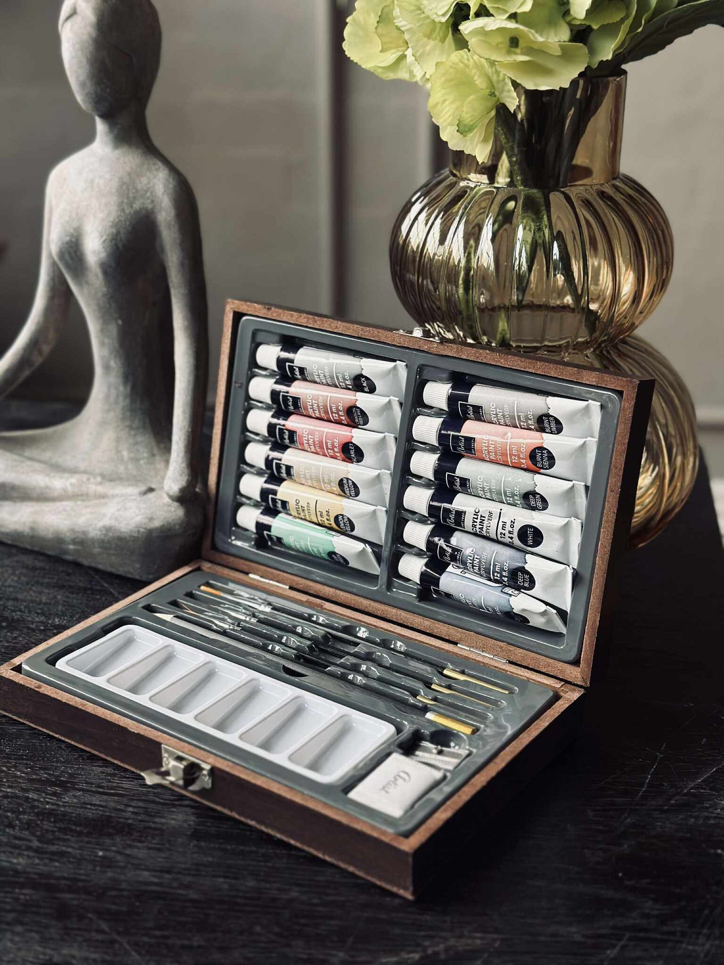 Kreakassen innehåller 19 delar som främjar kreativitet och mångsidighet i ditt skapande. Med 12 akrylfärger kan du experimentera med färgpaletter, medan pennvässaren och blyertspennan ger precision i skisser. Suddgummit erbjuder flexibilitet att justera och förbättra ditt arbete. Tre penslar i olika storlekar och en målarbricka kompletterar uppsättningen, vilket gör det enkelt att blanda och applicera färger.