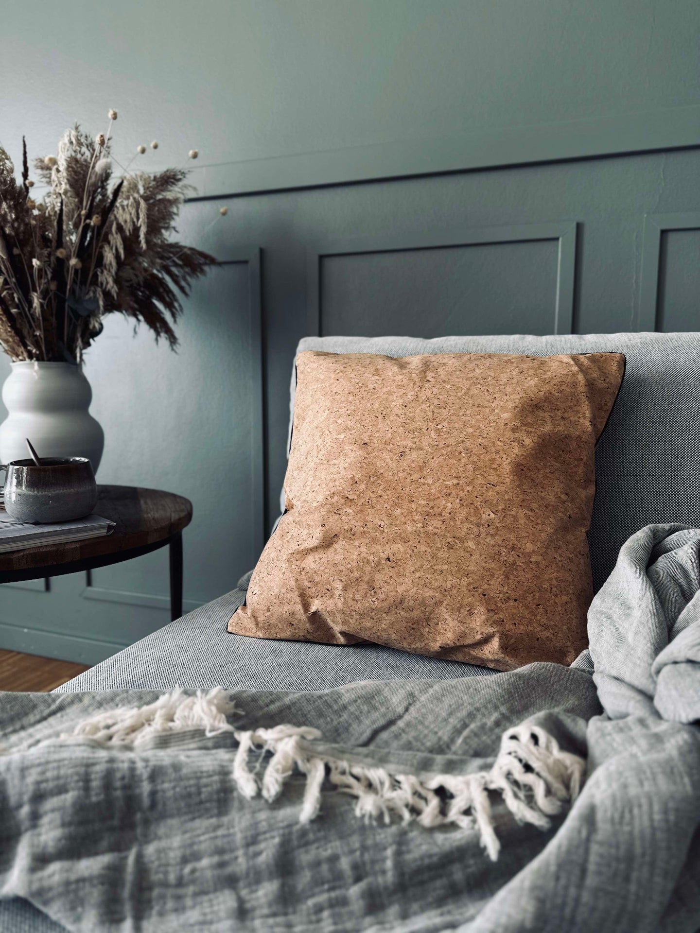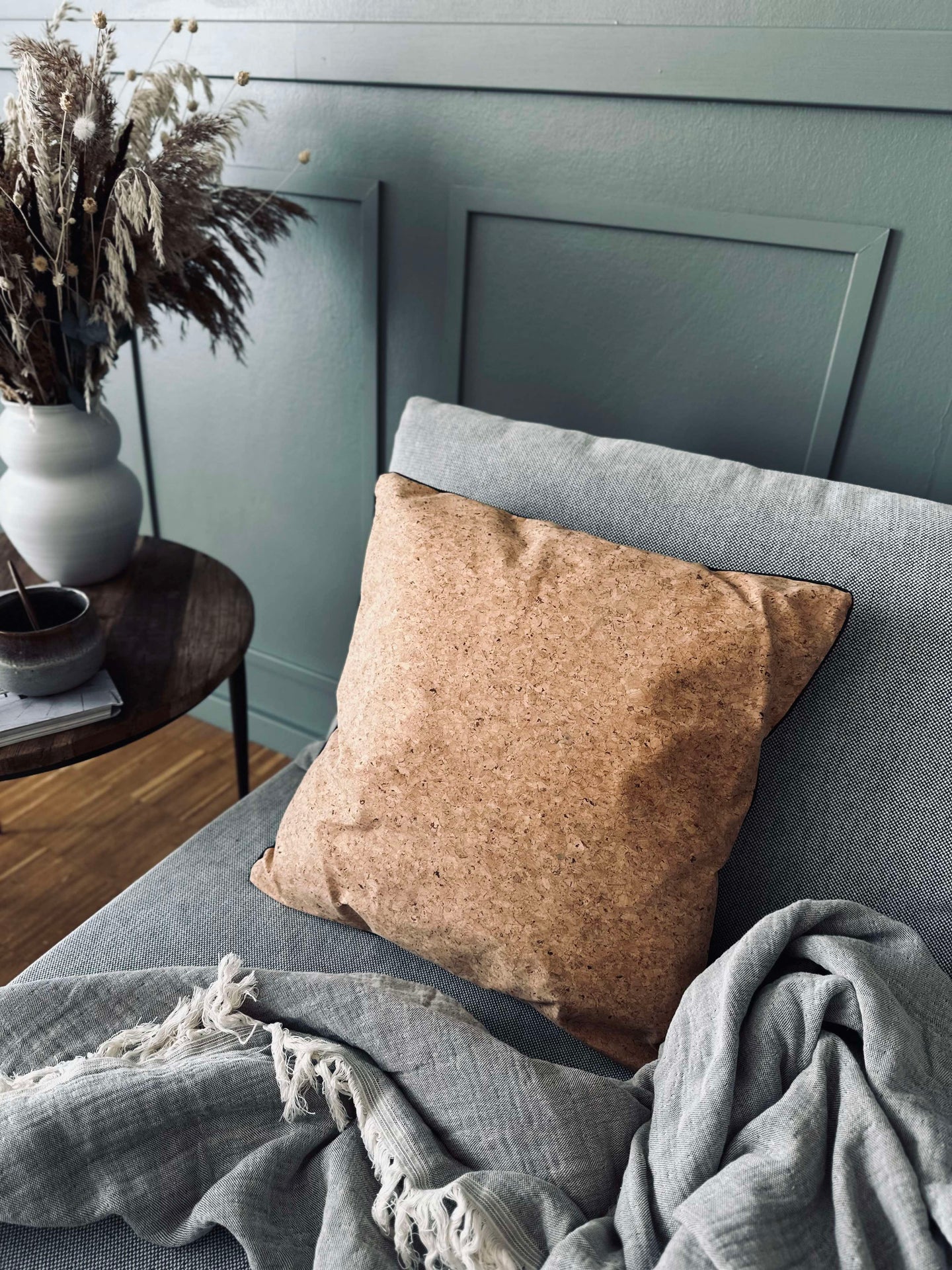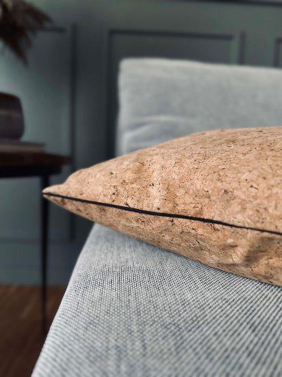 Överdraget är tillverkat av äkta korkkudde, vilket ger en naturlig och hållbar yta. Korkens särdrag gör den både vattenavvisande och fläckresistent, vilket förlänger produktens livslängd. Dessutom är korken mjuk och behaglig att röra vid, vilket ökar komforten vid användning. Den naturliga ventilationen i korken hjälper även till att hålla produkten fräsch längre.