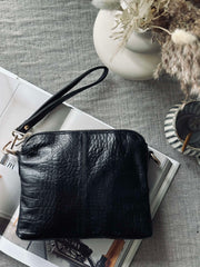 Denna crossbody-clutch är tillverkad av 100 % getläder, vilket ger en naturlig och hållbar känsla. Getläder är känt för sin mjukhet och styrka, vilket gör att väskan åldras vackert över tid. Insidan är fodrad med 100 % polyester, vilket skyddar innehållet mot fukt och slitage, samtidigt som det ger en lätt och smidig användning.