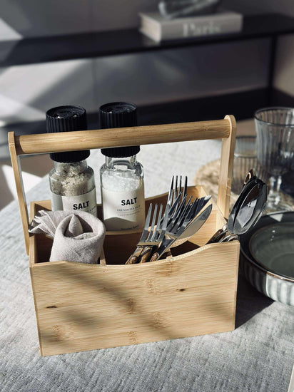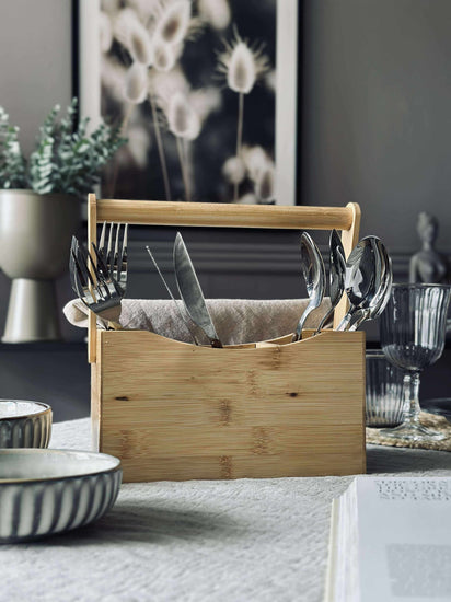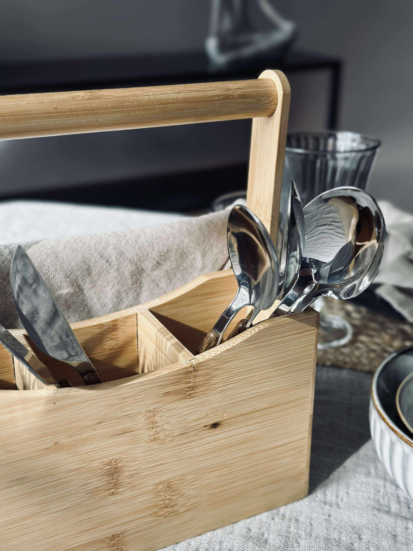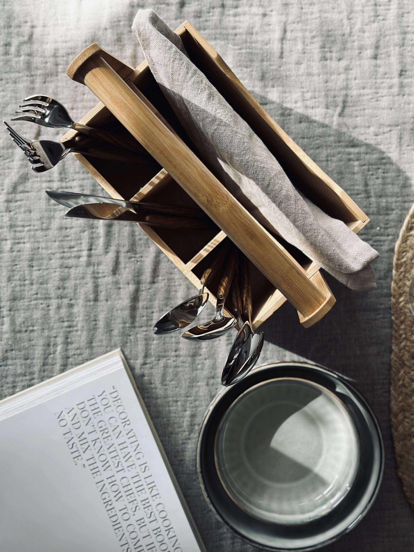 Besticklådan är tillverkad av bambu, vilket ger den en naturlig och hållbar struktur. Bambu är känt för sin snabbväxande och förnybara natur, vilket gör det till ett miljövänligt val för hemmet. Dessutom är bambu motståndskraftigt mot fukt, vilket hjälper till att hålla besticken torra och skyddade, samtidigt som det bidrar till en stilren och varm estetik i köket.