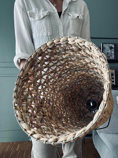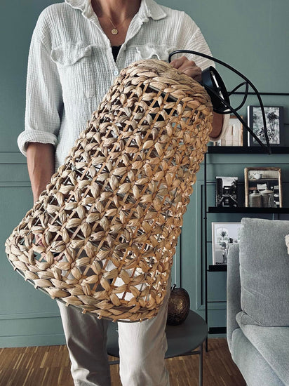 Vår vattenhyacintlampa är tillverkad av flätad vattenhyacint, vilket ger en naturlig och varm känsla i ditt vardagsrum. Materialet har en lätt men robust struktur som bidrar till en hållbar och miljövänlig belysningslösning. Den flätade designen skapar ett mjukt ljusspel i rummet, vilket bidrar till en avslappnande atmosfär. Dessutom är vattenhyacint ett förnybart material, vilket gör det till ett hållbart val för din inredning.