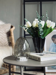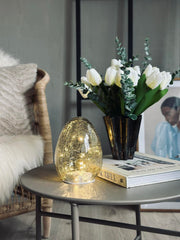 Tillverkad av glas sprider denna lampa ett jämnt och behagligt ljus i rummet. Glasmaterialet bidrar till en tidlös och stilren design som enkelt anpassar sig till olika inredningsstilar. Ljuset reflekteras genom glaset och skapar en varm atmosfär, vilket gör den till ett utmärkt val för både arbets- och viloutrymmen.