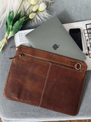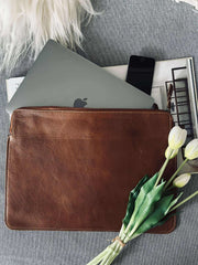 Trött på att leta efter viktiga saker i olika fickor? Denna laptopsleeve i cognacfärgat buffelläder ger enkel och säker förvaring av din dator och tillbehör. Skydda och organisera din teknik med stil och effektivitet, utan att kompromissa med funktionaliteten.