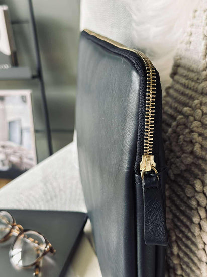 Har du någonsin oroat dig för att din bärbara dator ska repas eller skadas i väskan? Den svarta och guldiga laptopsleeven erbjuder ett stilrent sätt att skydda din dator under dagliga resor, samtidigt som den tillför en touch av diskret elegans.