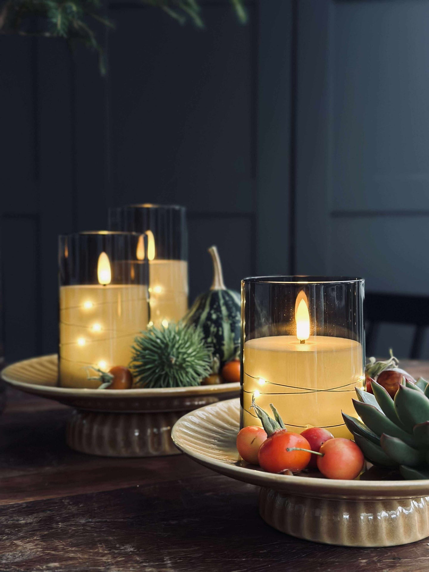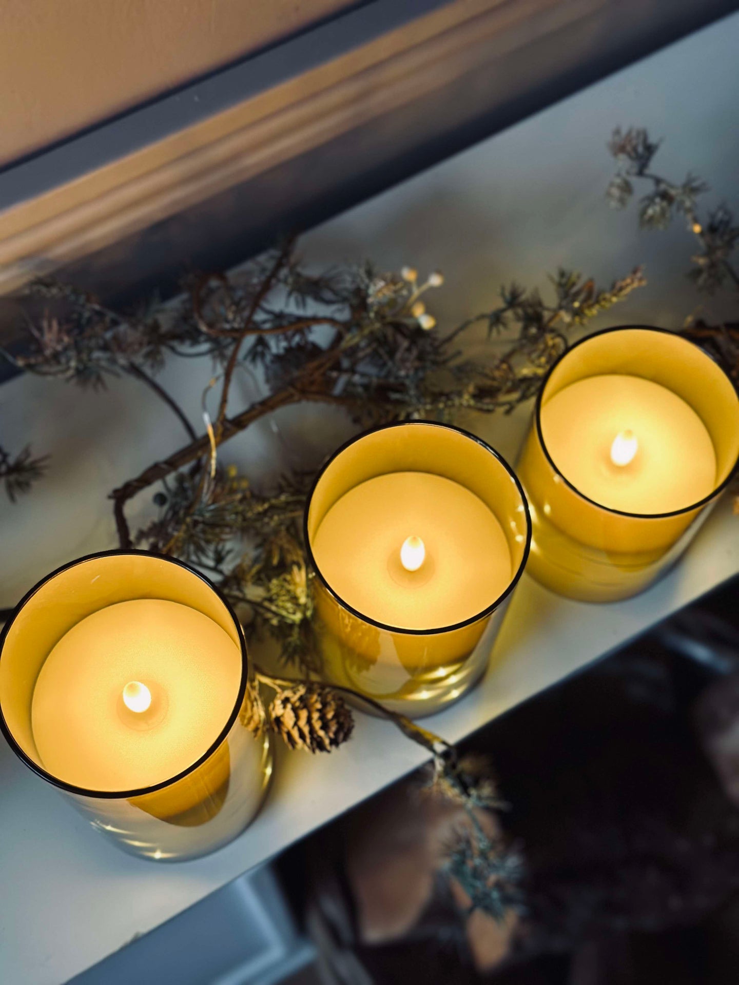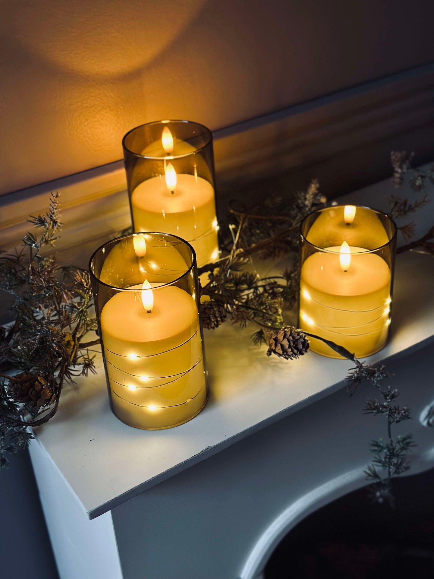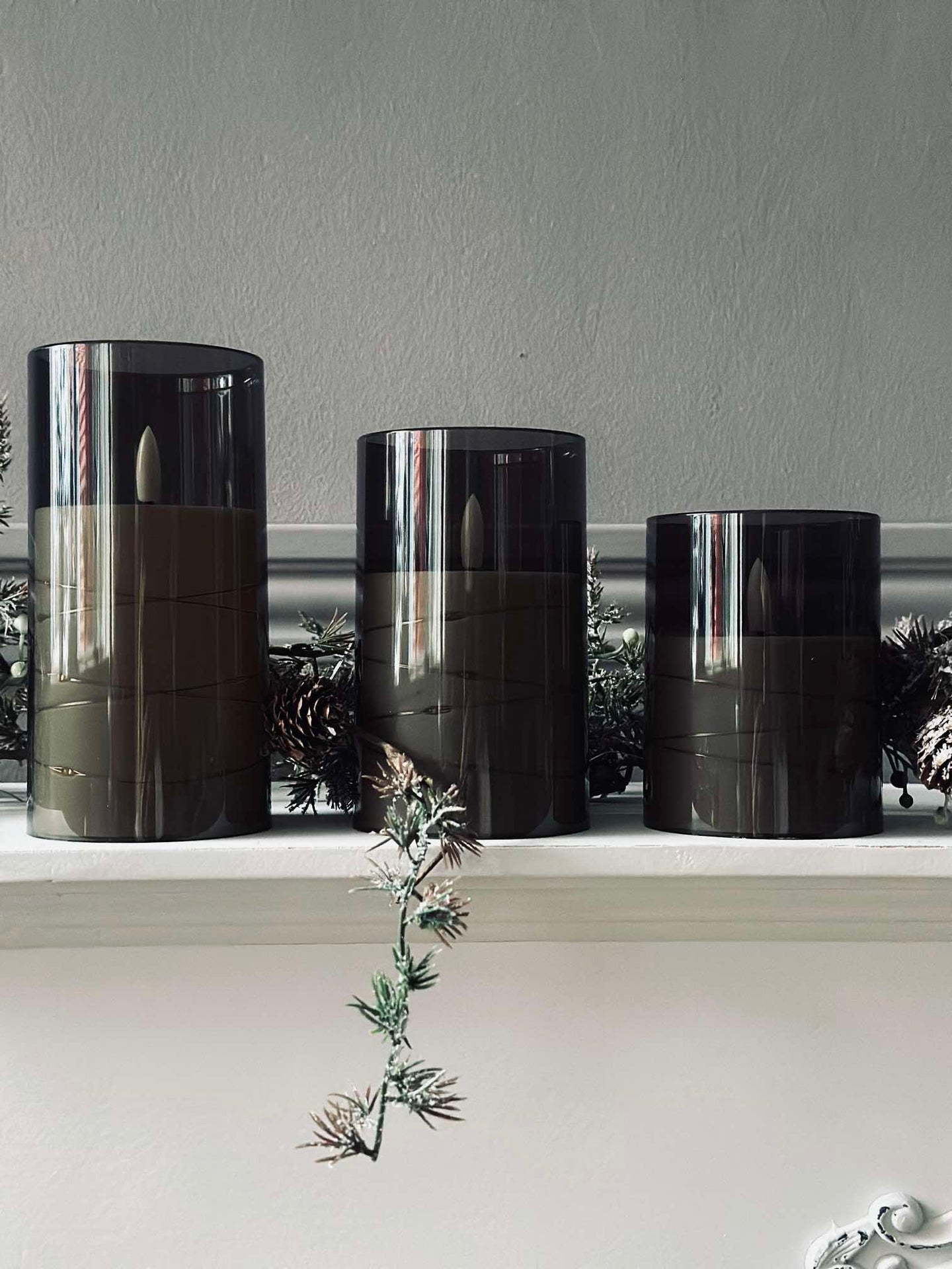 - LED-bloklys finns i ett set med tre storlekar: 12,5 cm, 15 cm och 17,5 cm i höjd samt 6 cm i diameter