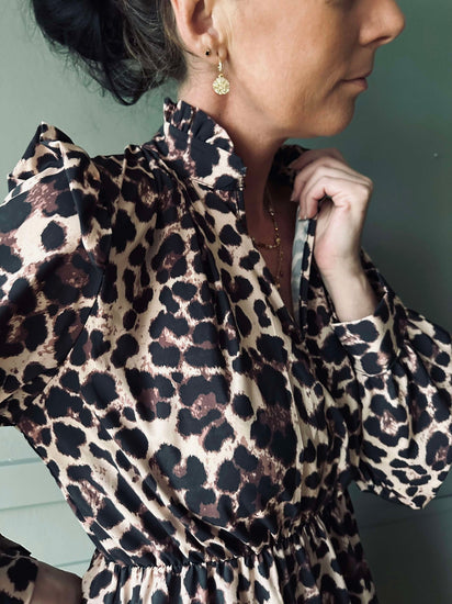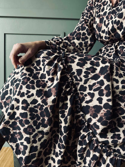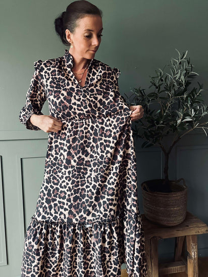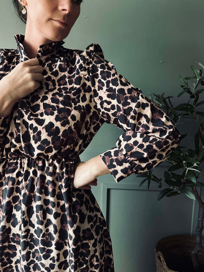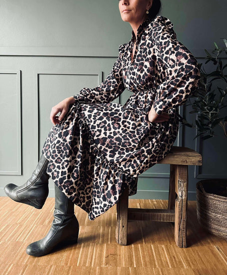 Varför inte lägga till denna eleganta klänning i din garderob för att enkelt klä upp eller ner din look? Ge dig själv möjligheten att känna dig bekväm och självsäker i denna vackra leopardklänning, oavsett tillfälle!