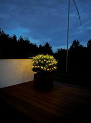 - Ljuskedjan laddas upp med solceller under soltimmar